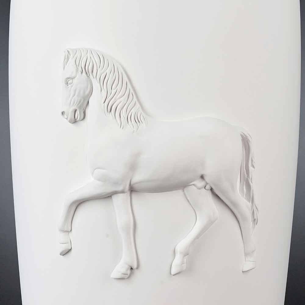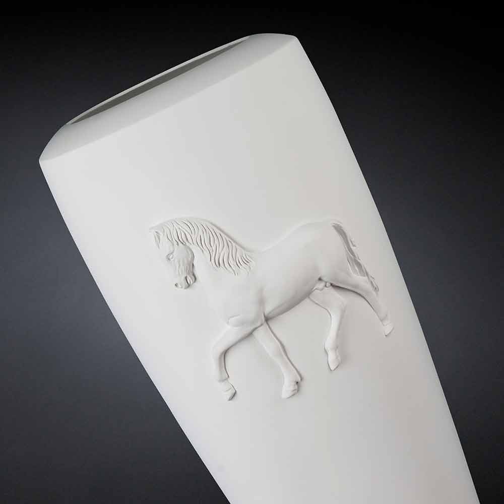 Dekoracyjny wazon ceramiczny wykonany ręcznie przez włoskich rzemieślników o nowoczesnym wyglądzie, z dekoracyjnym wyglądem przedstawiającym konia z ulgą.