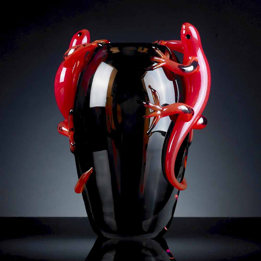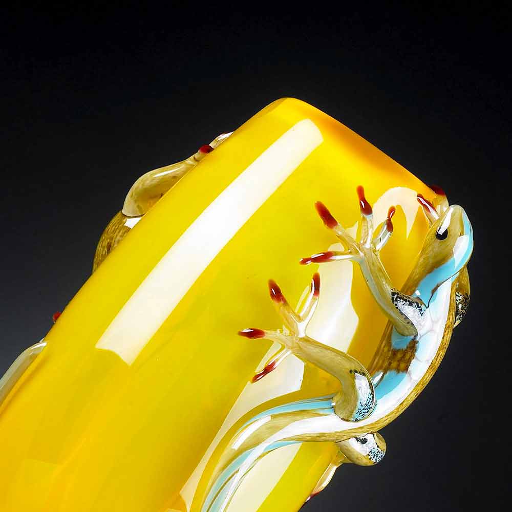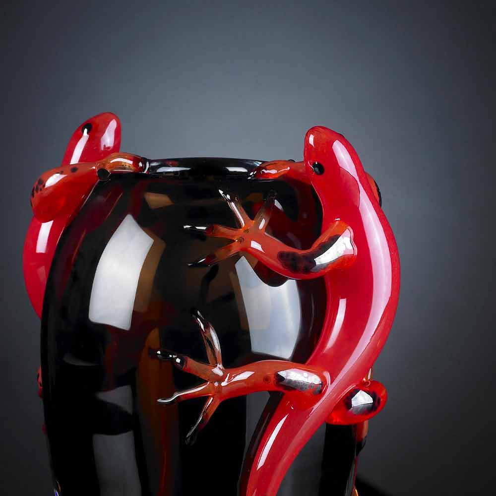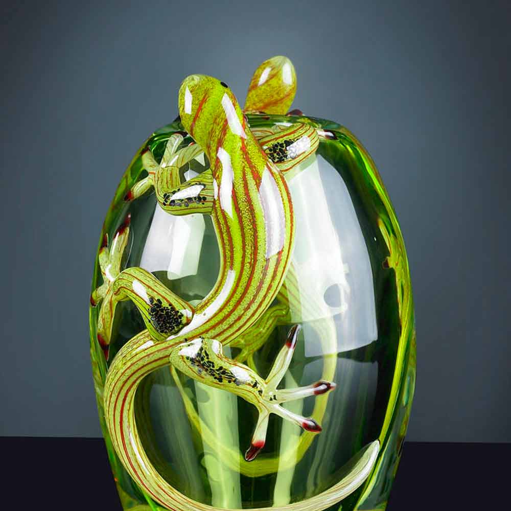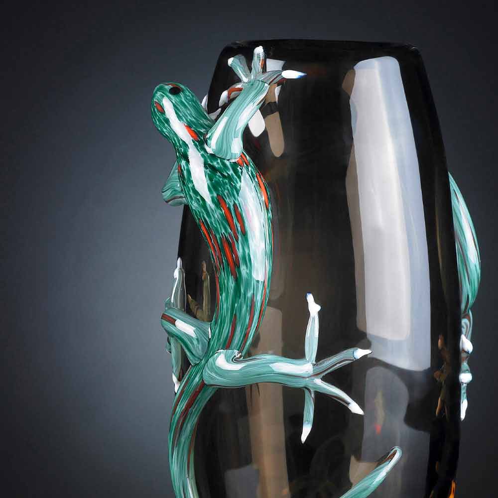 Ręcznie wykonany ornamentowy szklany wazon z 2 gekonami wyprodukowany we Włoszech.