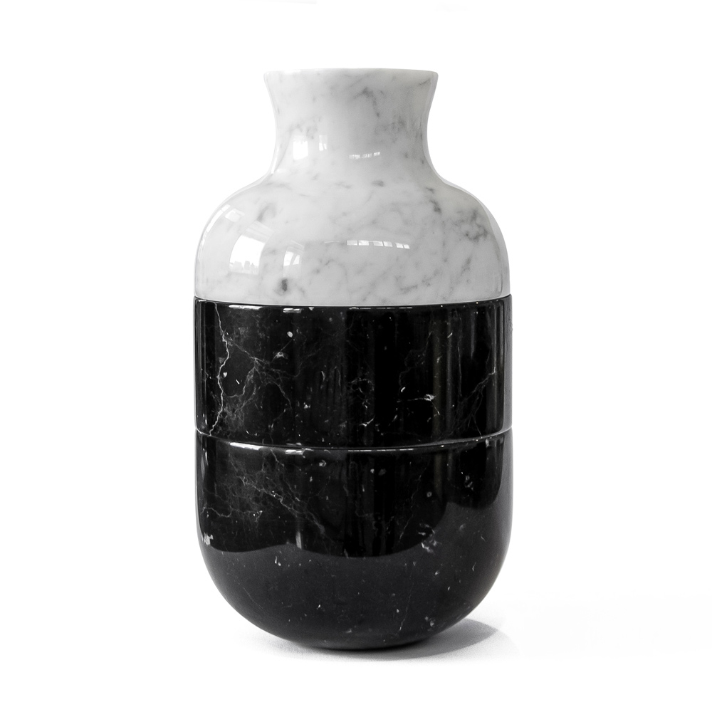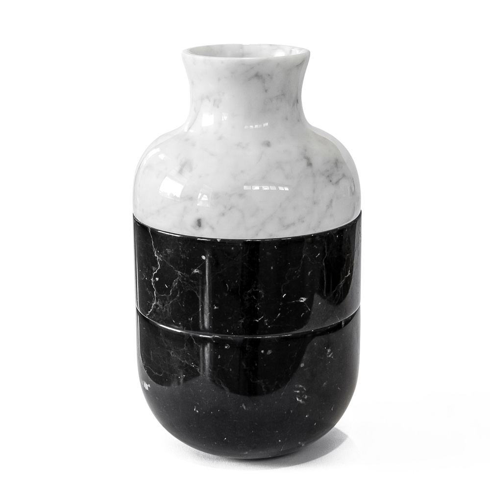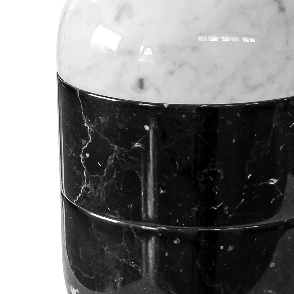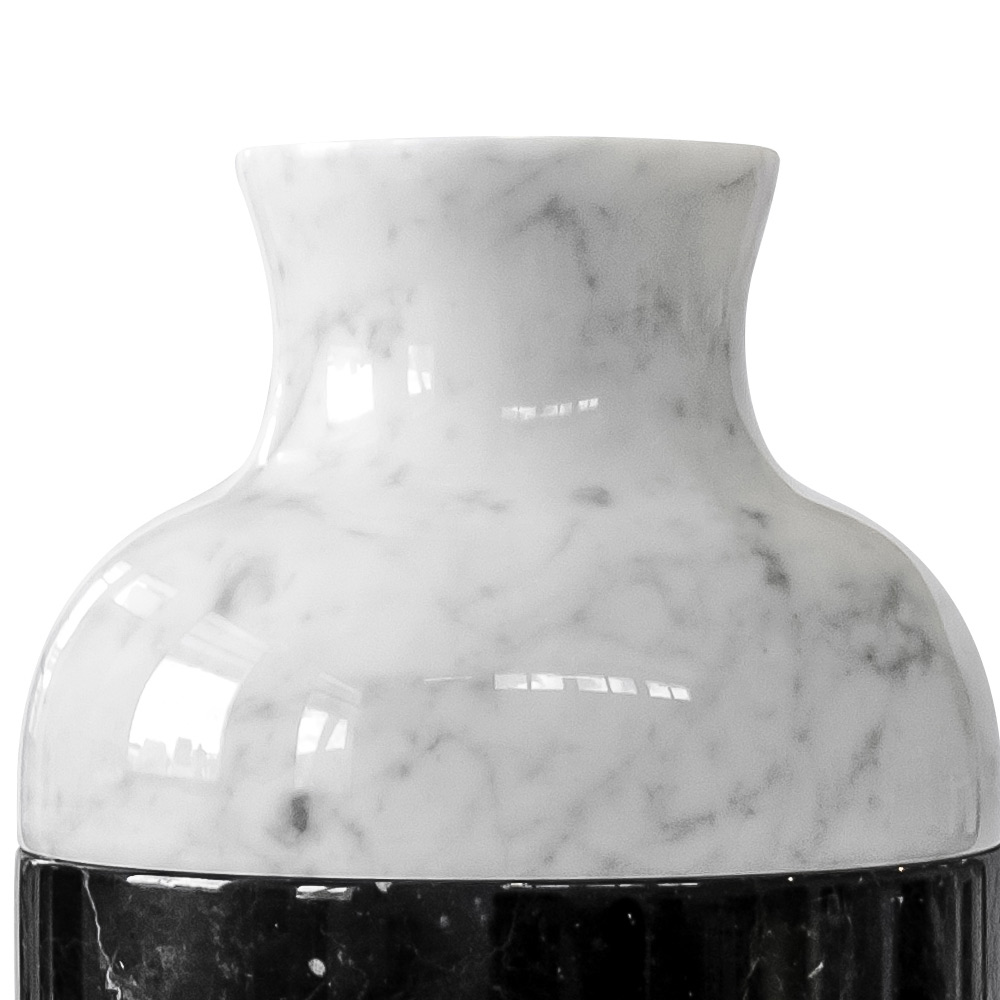 Ten dekoracyjny wazon ma rzemieślniczy i luksusowy design podzielony na 3 części, w całości wykonany z białego marmuru Carrara i czarnego satynowego marmuru Marquinia.