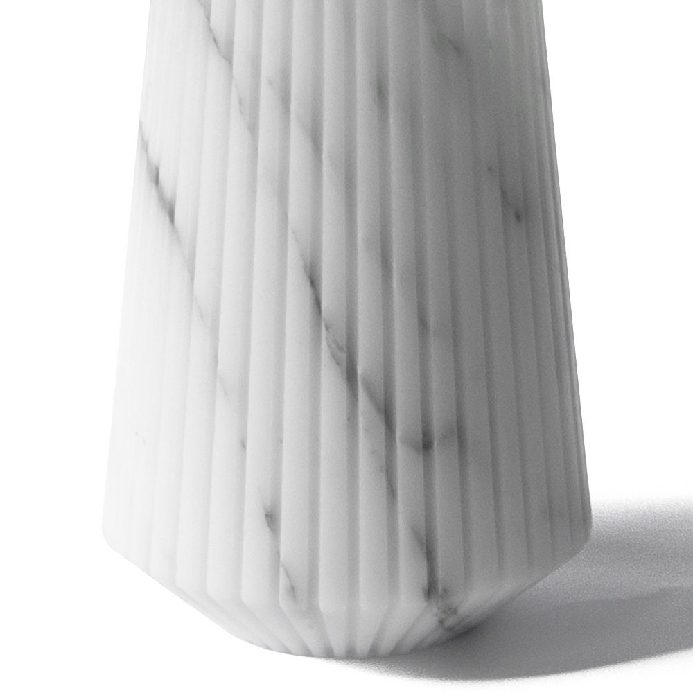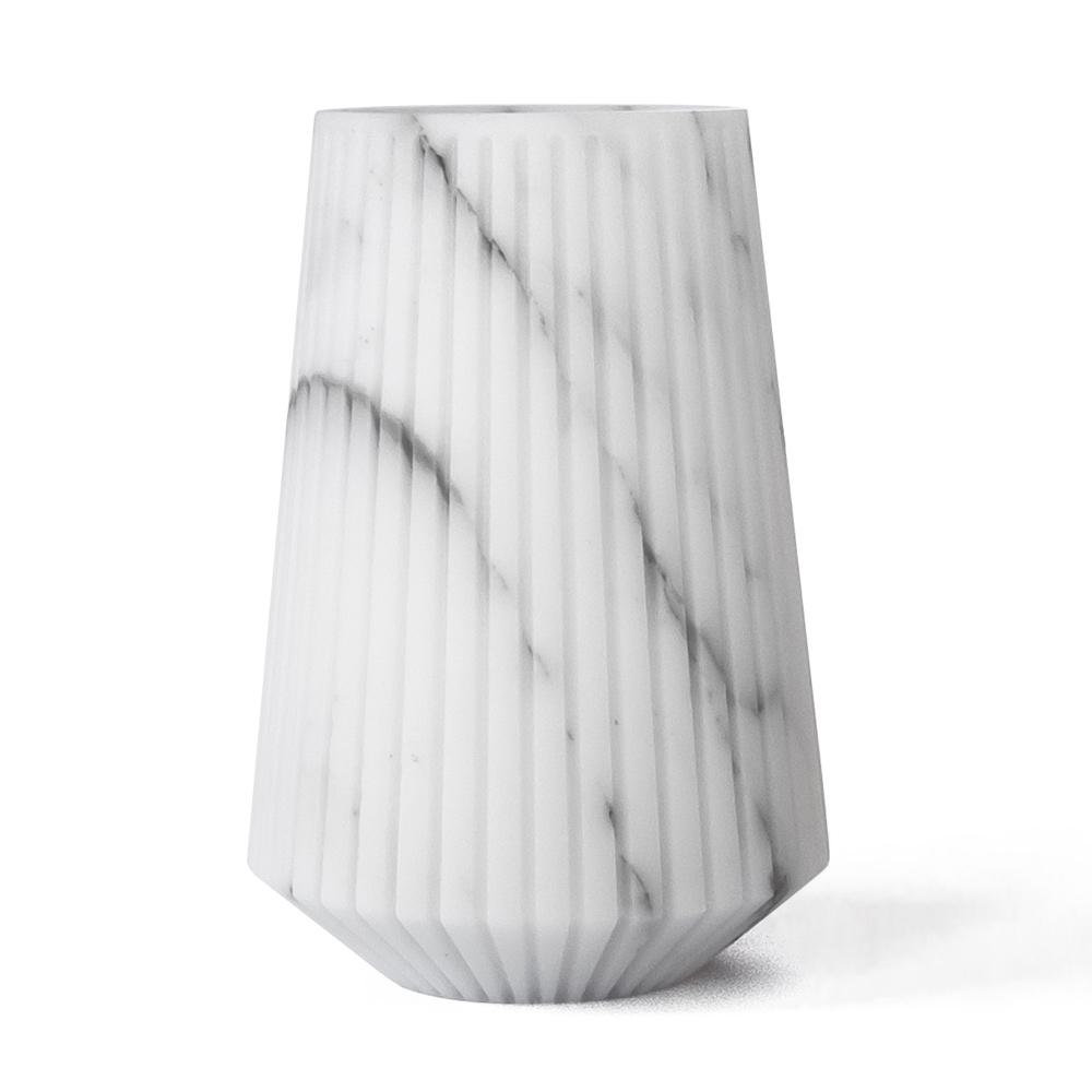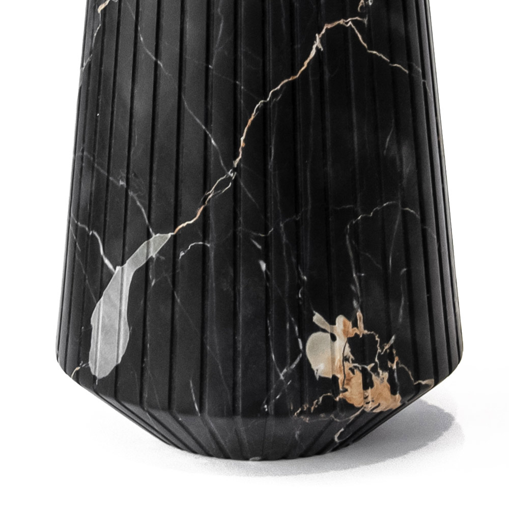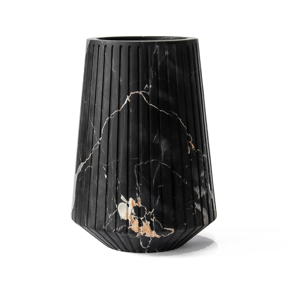 Średni wazon dekoracyjny z białego lub czarnego marmuru w paski wyprodukowany we Włoszech.