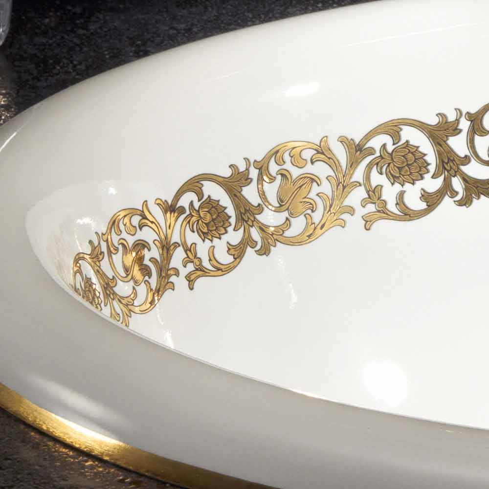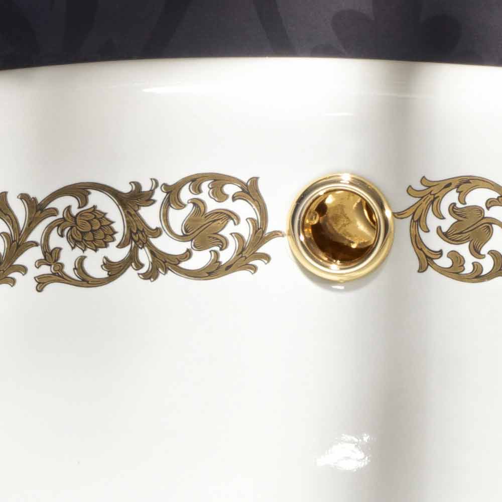 Umywalka do łazienki wykonana we Włoszech w glinie ogniowej, ręcznie wykonana, zdobiona, z paskiem w złotym sosnowym stożku i 24-karatowym złotym brzegiem.