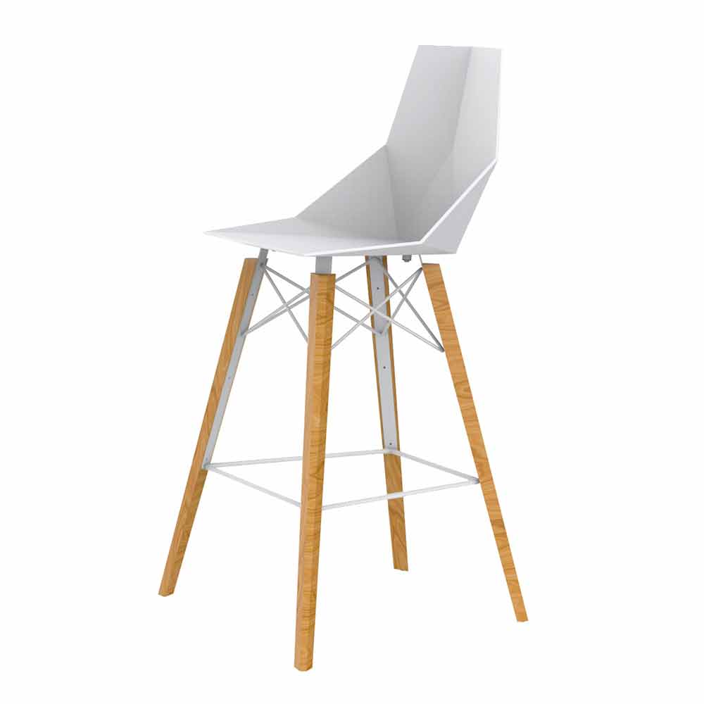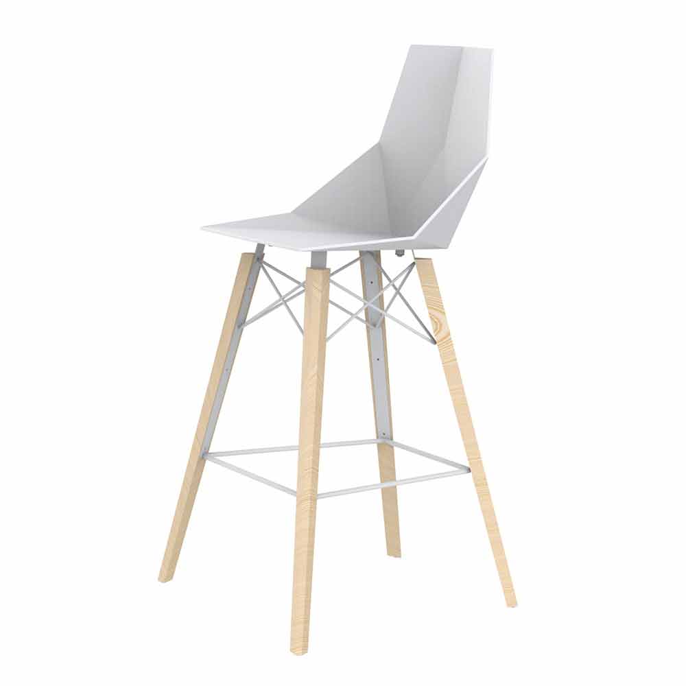 Stołek barowy o konstrukcji z drewna jesionowego z siedziskiem i oparciem z polipropylenu w różnych kolorach.