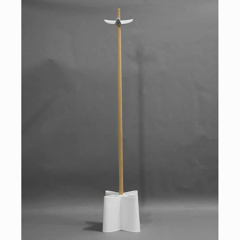 Nowoczesny wieszak na ubrania z obciążoną podstawą, konstrukcją z drewna bukowego i detalami z polipropylenu.