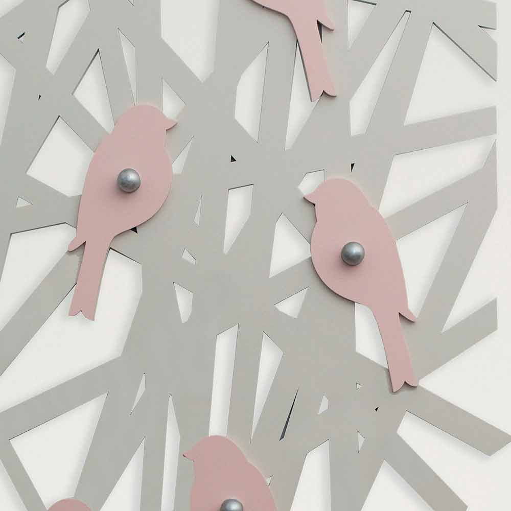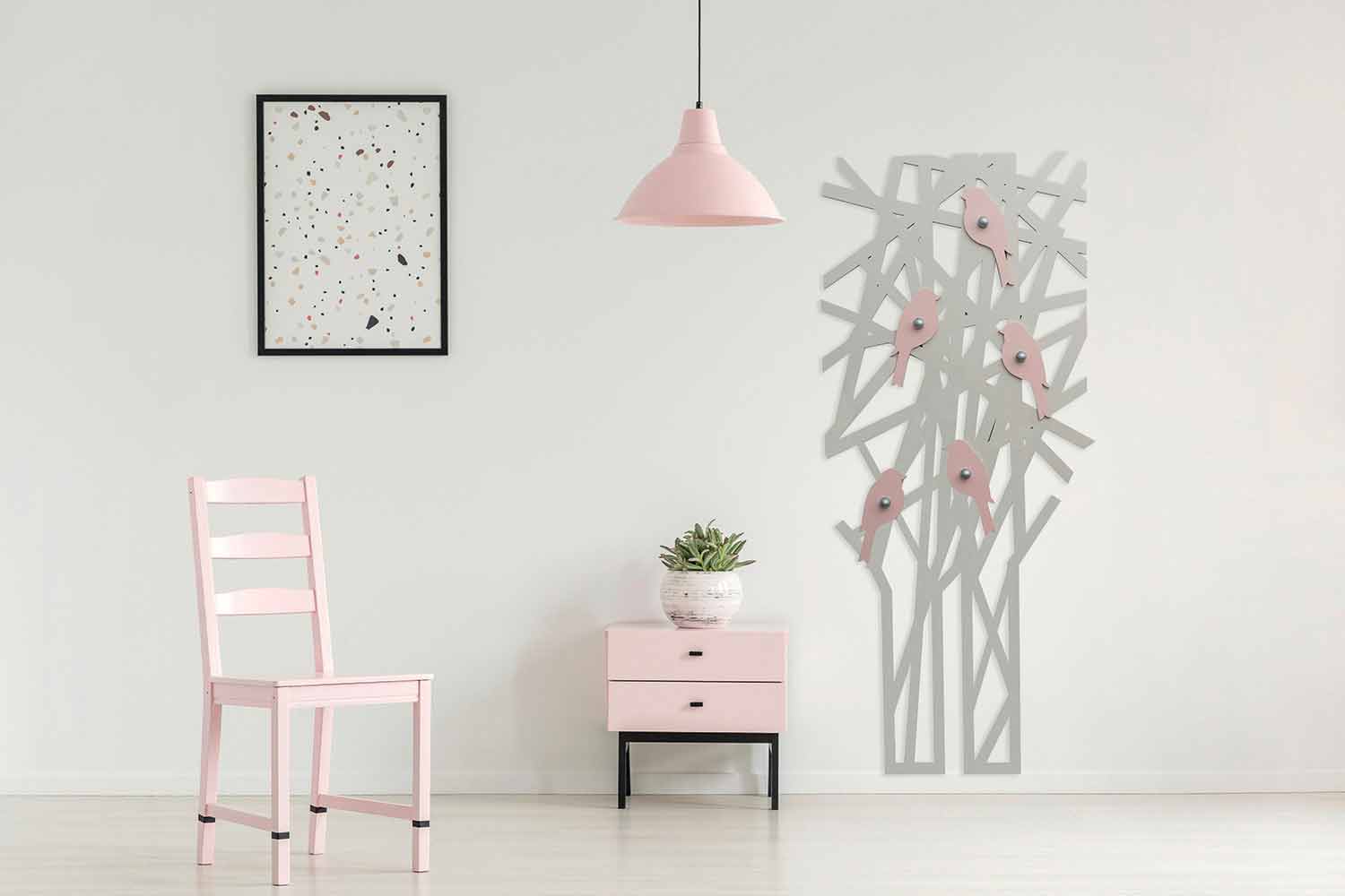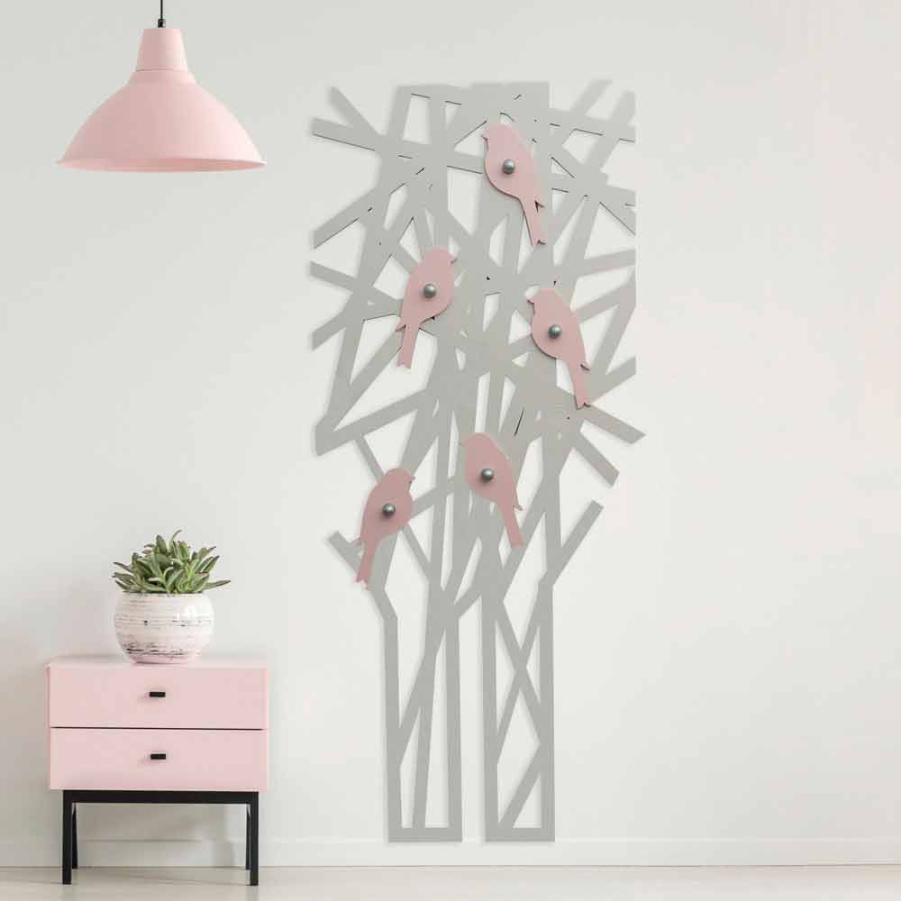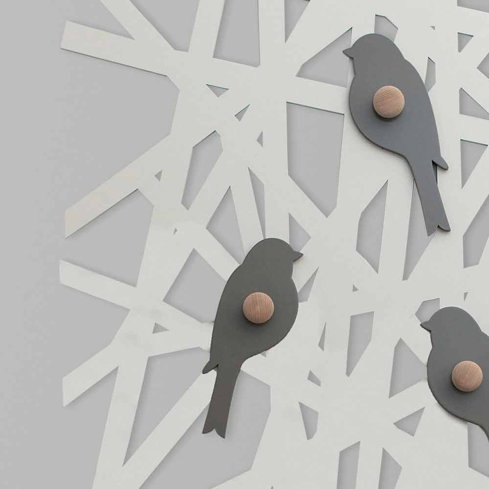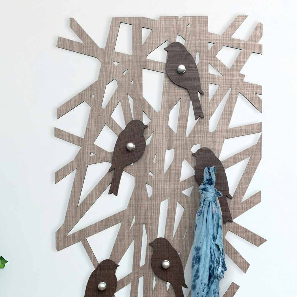 Wieszak ścienny na wejście, nowoczesny design w kształcie stylizowanego drzewa z ptakami, wykonany we Włoszech.