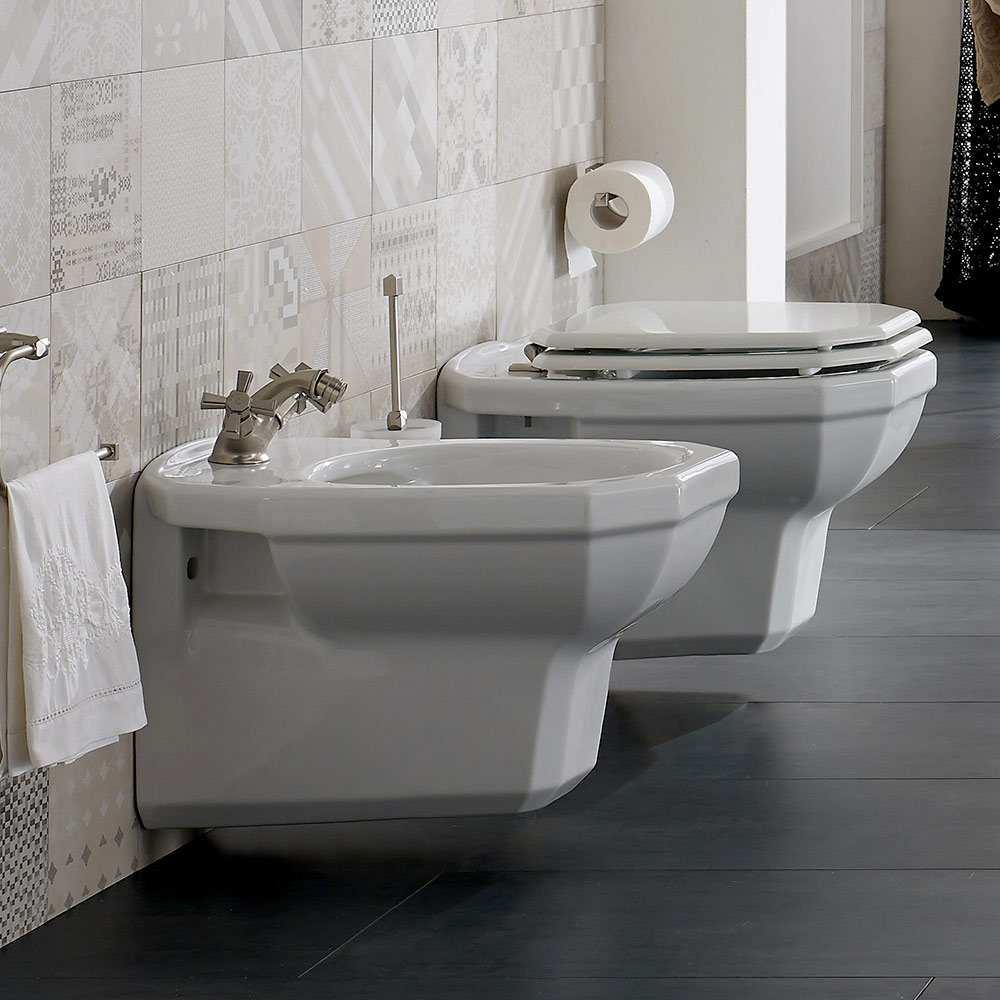 Biała ceramiczna toaleta wisząca Nausica w klasycznym stylu, wyprodukowana we Włoszech.