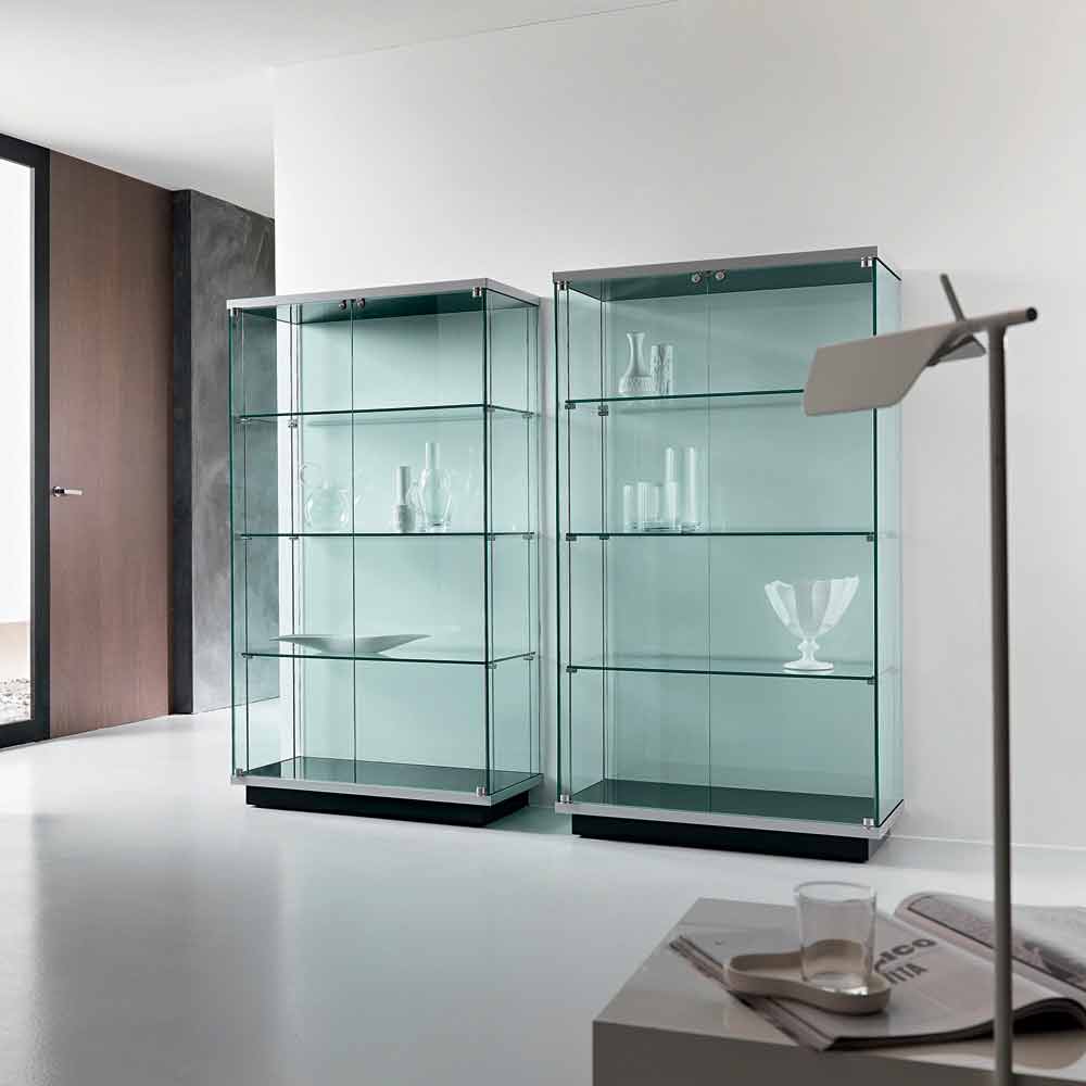Dwudrzwiowa witryna z zamkiem wykonana jest w całości z przezroczystego szkła hartowanego z trzema półkami z podstawą, blatem i cokołem z lakierowanego na czarno drewna.