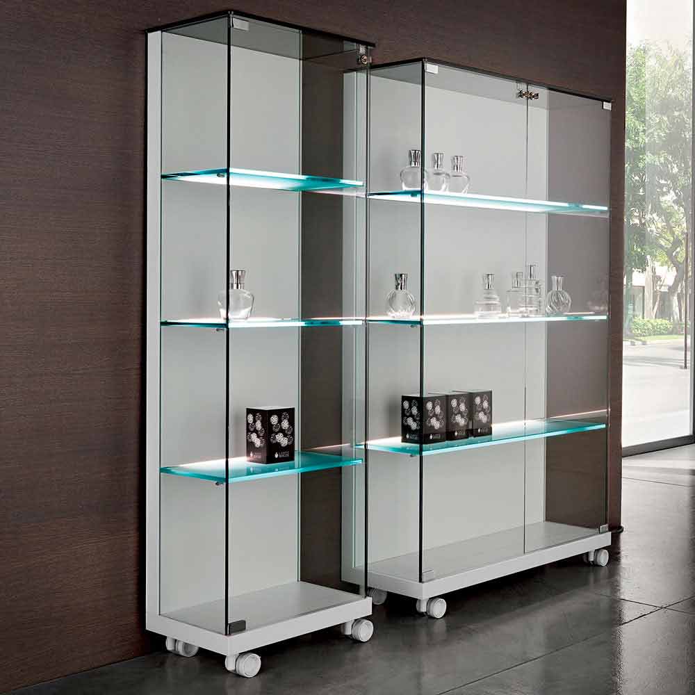 Dwudrzwiowa witryna z kółkami ułatwiającymi poruszanie się wykonana jest z przezroczystego szkła hartowanego i konstrukcji z lakierowanego na biało matowego drewna.