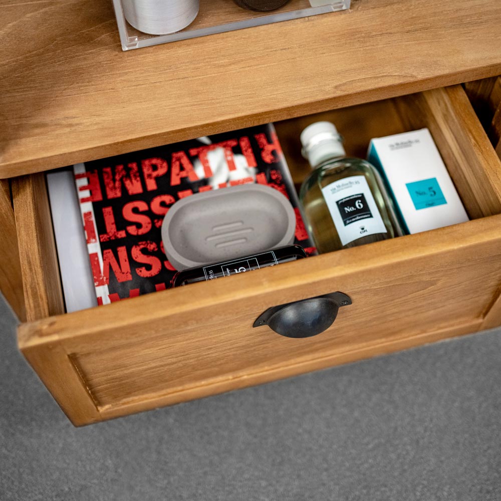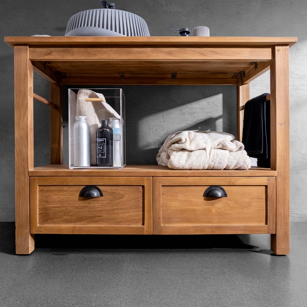 Ta szafka łazienkowa to elegancki przykład funkcjonalności i stylu, idealny do dodania klasy każdemu wnętrzu. Wykonany z najwyższej jakości litego drewna tekowego z odzysku , ten mebel jest nie tylko estetyczny, ale także zrównoważony dzięki zastosowaniu w 100% naturalnego materiału, starannie woskowanego, aby zapewnić wytrzymałość i trwałość. Posiada dwie przestronne szuflady u podstawy, każda ozdobiona uchwytami w stylu vintage , które dodają szafce niepowtarzalnego charakteru. Niewątpliwą funkcjonalność dopełniają dwa wieszaki na ręczniki zamontowane po bokach mebla.