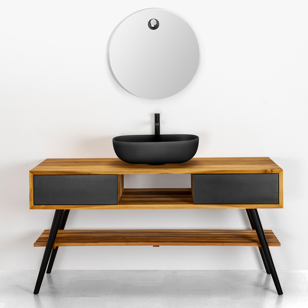 Szafka łazienkowa z naturalnego drewna tekowego z czarnymi nogami i szufladami.