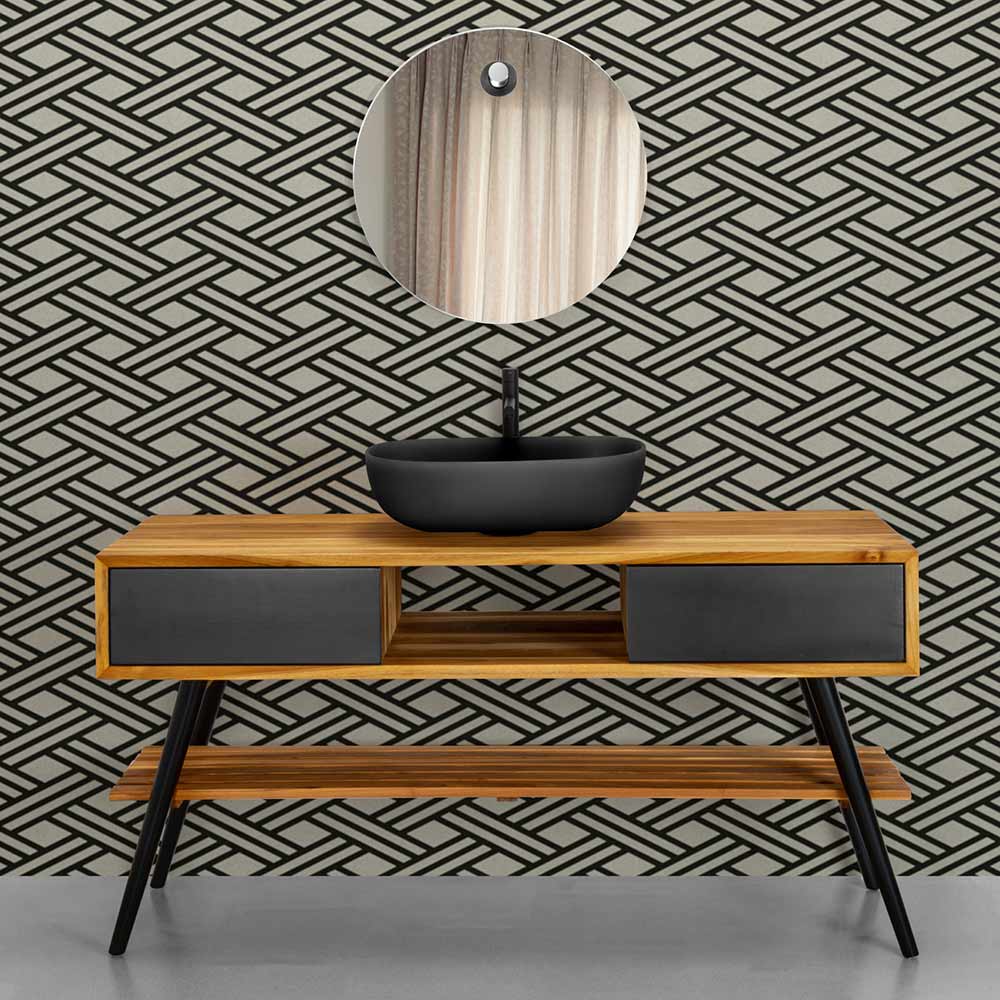Wolnostojąca szafka łazienkowa o strukturze naturalnego drewna tekowego pochodzącego z recyklingu wzbogacona o 2 szuflady z matowego, malowanego na czarno drewna mahoniowego, pasującego do nóg. Elegancki i stylowy dobór kolorów, który wyróżnia się w każdej sytuacji wyposażenia, czyniąc go fascynującym i tajemniczym oraz opowiadającym o ekskluzywnej atmosferze i wyjątkowych emocjach. Celowo graficzna estetyka wzmocniona jeszcze bardziej przez połączenie podwójnej szuflady na elewację.