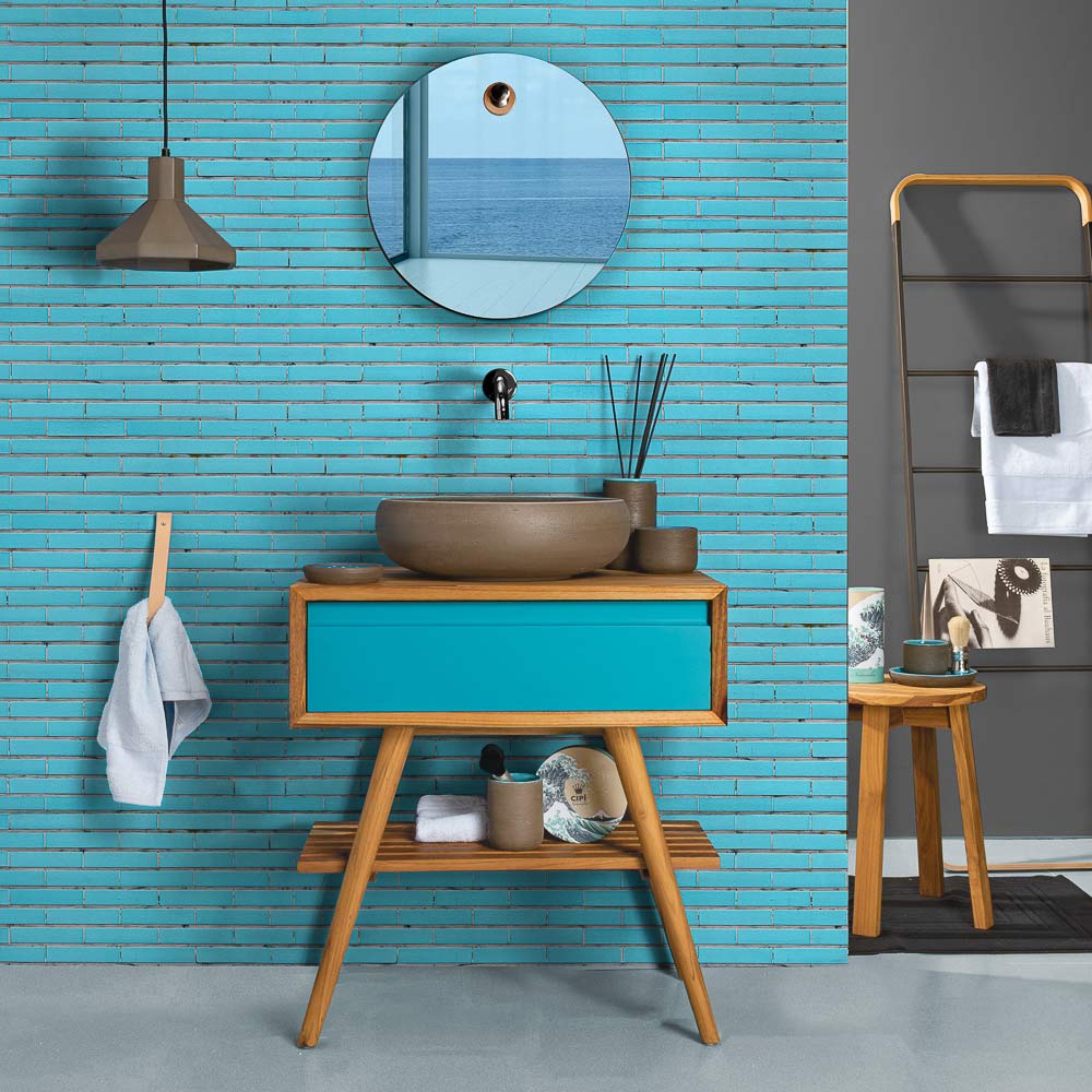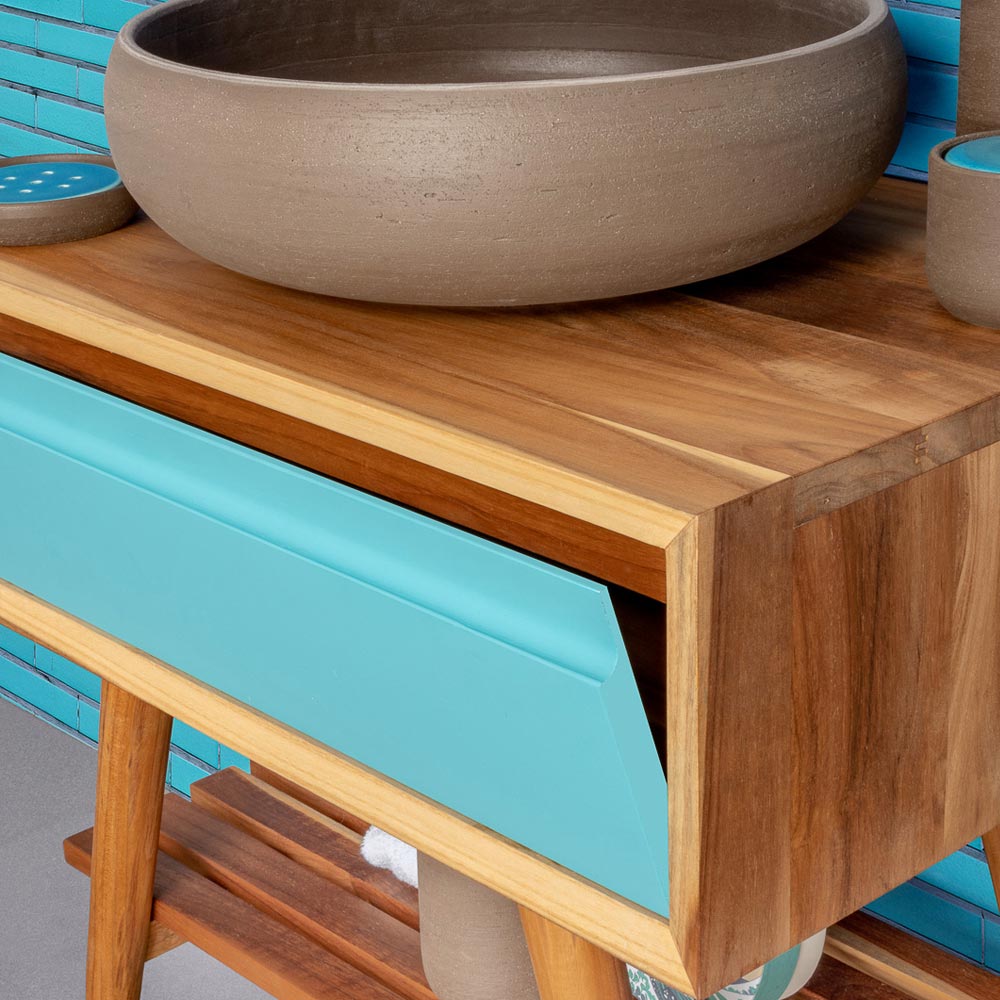 Szafka łazienkowa stojąca z naturalnego drewna tekowego odzyskanego z szufladą z klapką w kolorze niebieskiego drewna mahoniowego nawiązującego do spokoju i spokoju kojarzonego z naturalnymi elementami, takimi jak woda i powietrze, dające efekty relaksujące, emocje nawiązujące do uroku panującego w naturze. Jego struktura charakteryzuje się prostymi kształtami i praktycznymi przestrzeniami idealnymi do zorganizowania łazienki w elegancki i funkcjonalny sposób, aby uzyskać oryginalny efekt o silnej, nowoczesnej osobowości .
