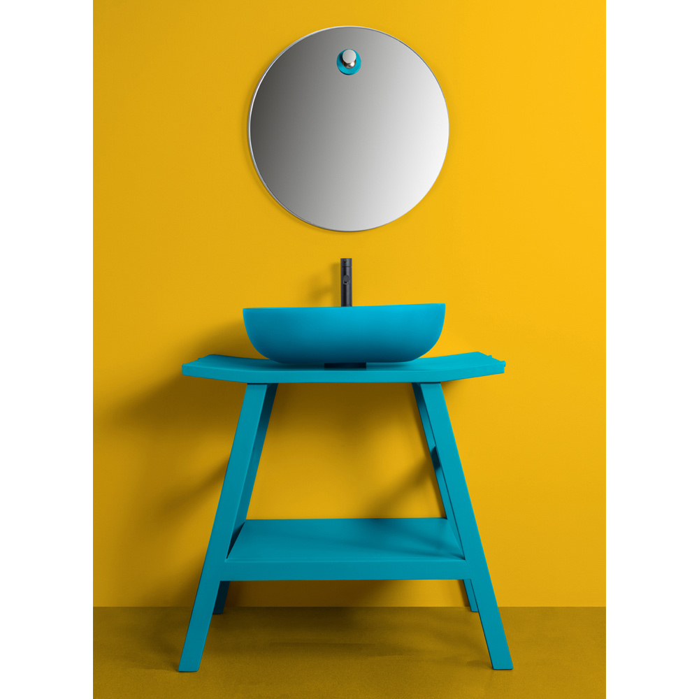 Wolnostojąca szafka łazienkowa wykonana z naturalnego odzyskanego drewna tekowego pomalowanego na niebiesko , kolor nawiązujący do spokoju i spokoju, wywołujący wrażenie zanurzenia się w błękicie sardyńskiego morza, emocje, które nawiązują do przytłaczającego uroku przyrody w głębi lądu. Jego struktura charakteryzuje się lekko zakrzywionym kształtem blatu, który nadaje ekskluzywny i wyrafinowany charakter estetyce produktu. W komplecie z 4 praktycznymi wieszakami na ręczniki i funkcjonalną półką do przechowywania .