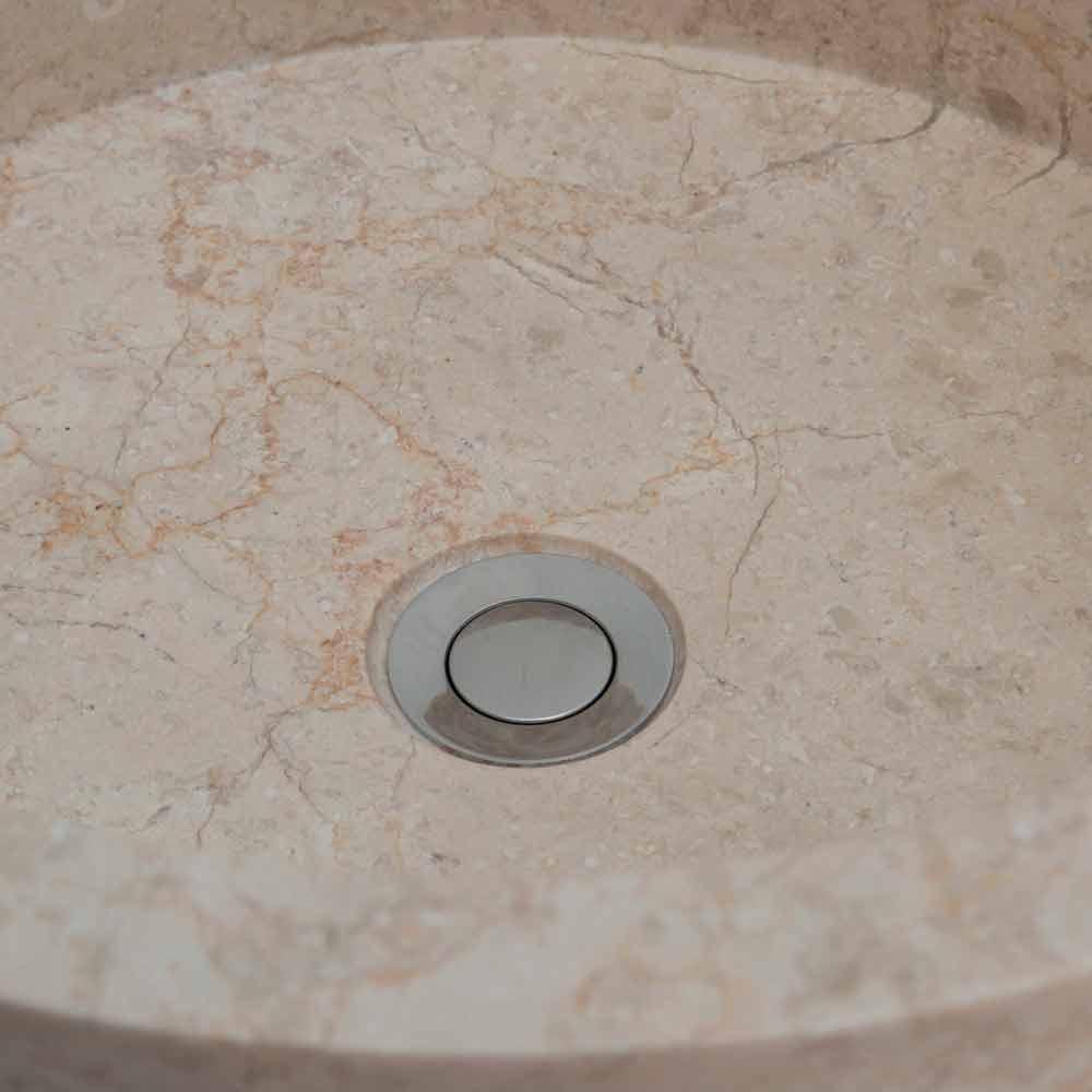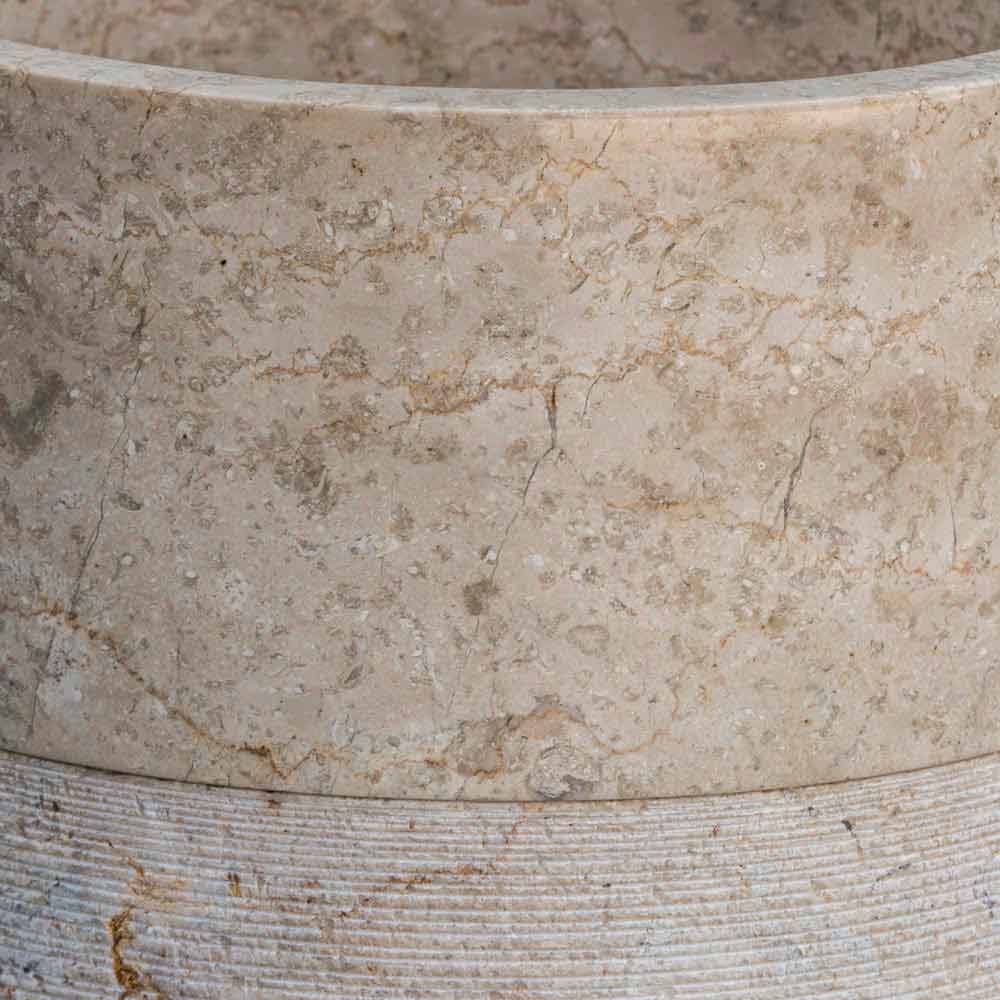 Wolnostojąca umywalka marmurowa w odcieniach od kości słoniowej do kremowych i ciepłych wariacjach. Złożona z dwóch części, pierwsza „umywalka” jest z polerowanego marmuru zarówno zewnętrznie, jak i wewnętrznie. Druga część to „podstawa” wykonana poprzez dekorowanie surowego marmuru efektem toczenia. Rodzaj obróbki zastosowanej do podstawy może powodować pęknięcia lub pęknięcia w marmurze, które w żaden sposób NIE NARUSZAJĄ integralności ani bezpieczeństwa zlewu. Takie sytuacje nie są uważane za wady produktu.