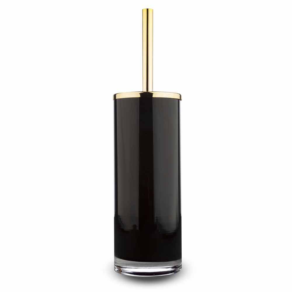 Akcesoria łazienkowe nablatowe z czarnego szkła i złotego metalu.