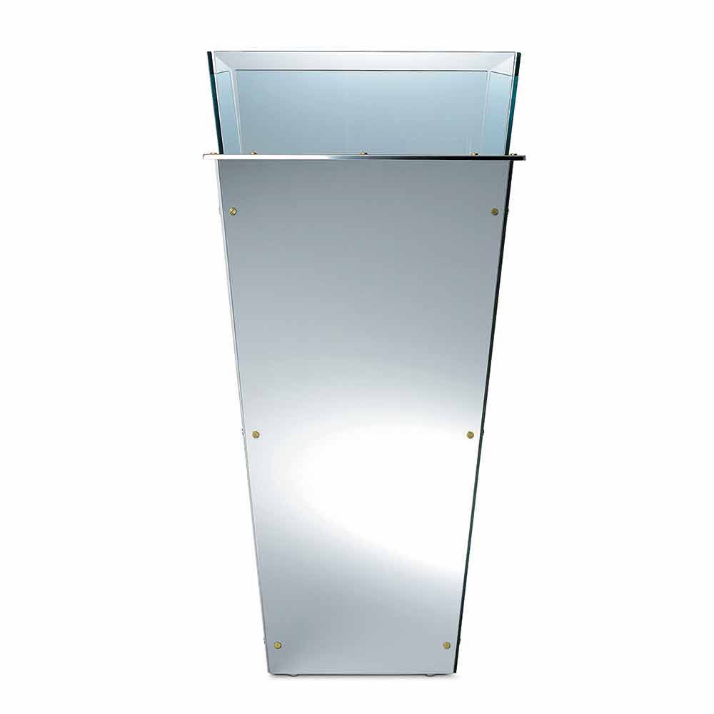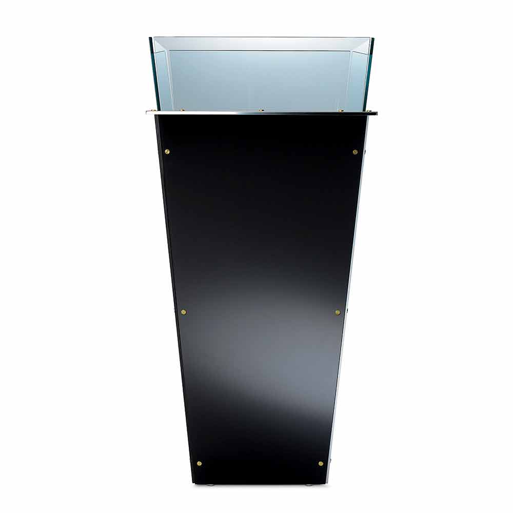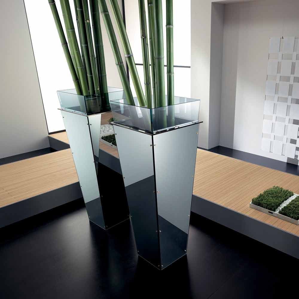 Ten wolnostojący wazon dostępny w różnych rozmiarach charakteryzuje się wymiennymi panelami bocznymi w wielu wykończeniach, takich jak: czarne lakierowane szkło, białe lakierowane szkło, lustro lub skóra.