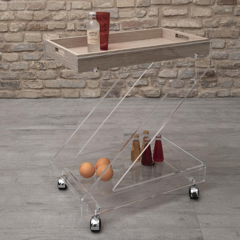 Wózek z przezroczystego kryształu akrylowego z kółkami i tacą z 2 wykończeniami, wyprodukowany we Włoszech.
