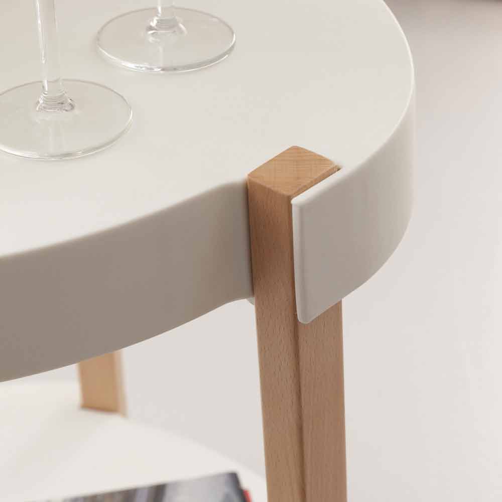 Nowoczesny wózek barowy w stylu skandynawskim, wykonany z drewna bukowego (wykończenie z naturalnego drewna) i białego polipropylenu.