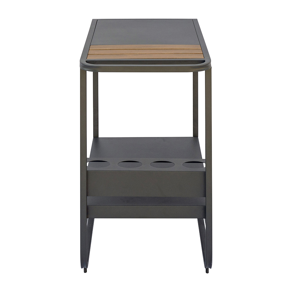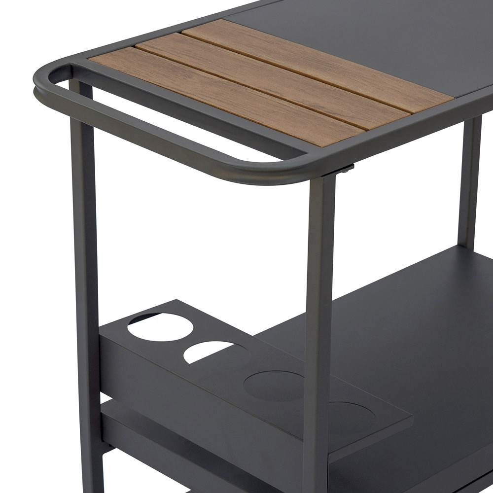 Górna półka z detalami z żywicy drzewnej dodaje nowoczesnemu wzornictwu ciepłego, naturalnego akcentu, tworząc przyjemny kontrast estetyczny. Dolna półka i zintegrowany uchwyt na butelki oferują dodatkową przestrzeń do przechowywania napojów, szklanek i akcesoriów, dzięki czemu wózek idealnie nadaje się na lunch, aperitif lub kolację na świeżym powietrzu.