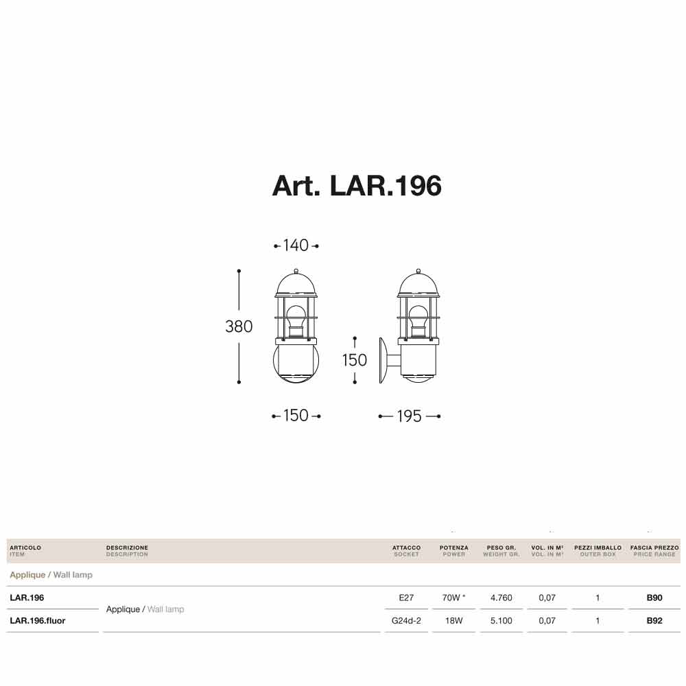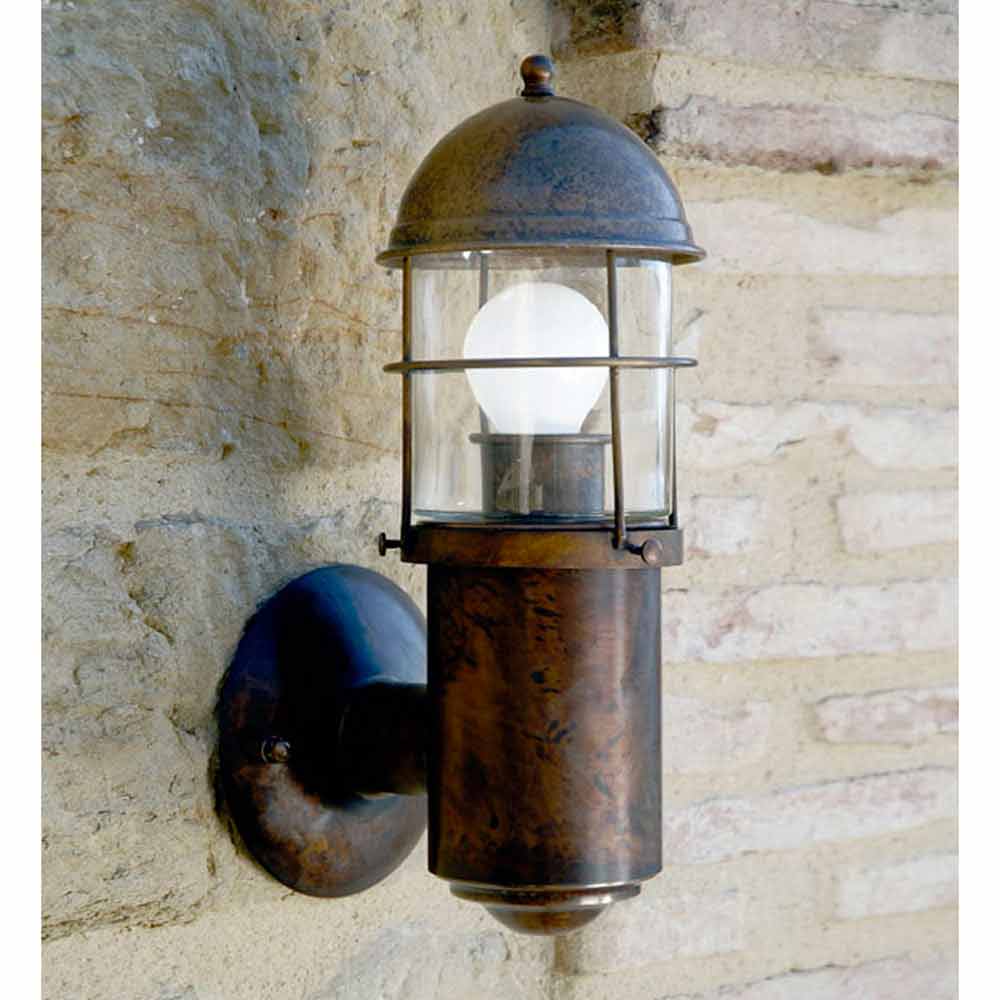 Zewnętrzny designerski kinkiet ścienny Attila autorstwa Aldo Bernardi, wykonany z postarzanej miedzi i postarzanego mosiądzu, IP 44.