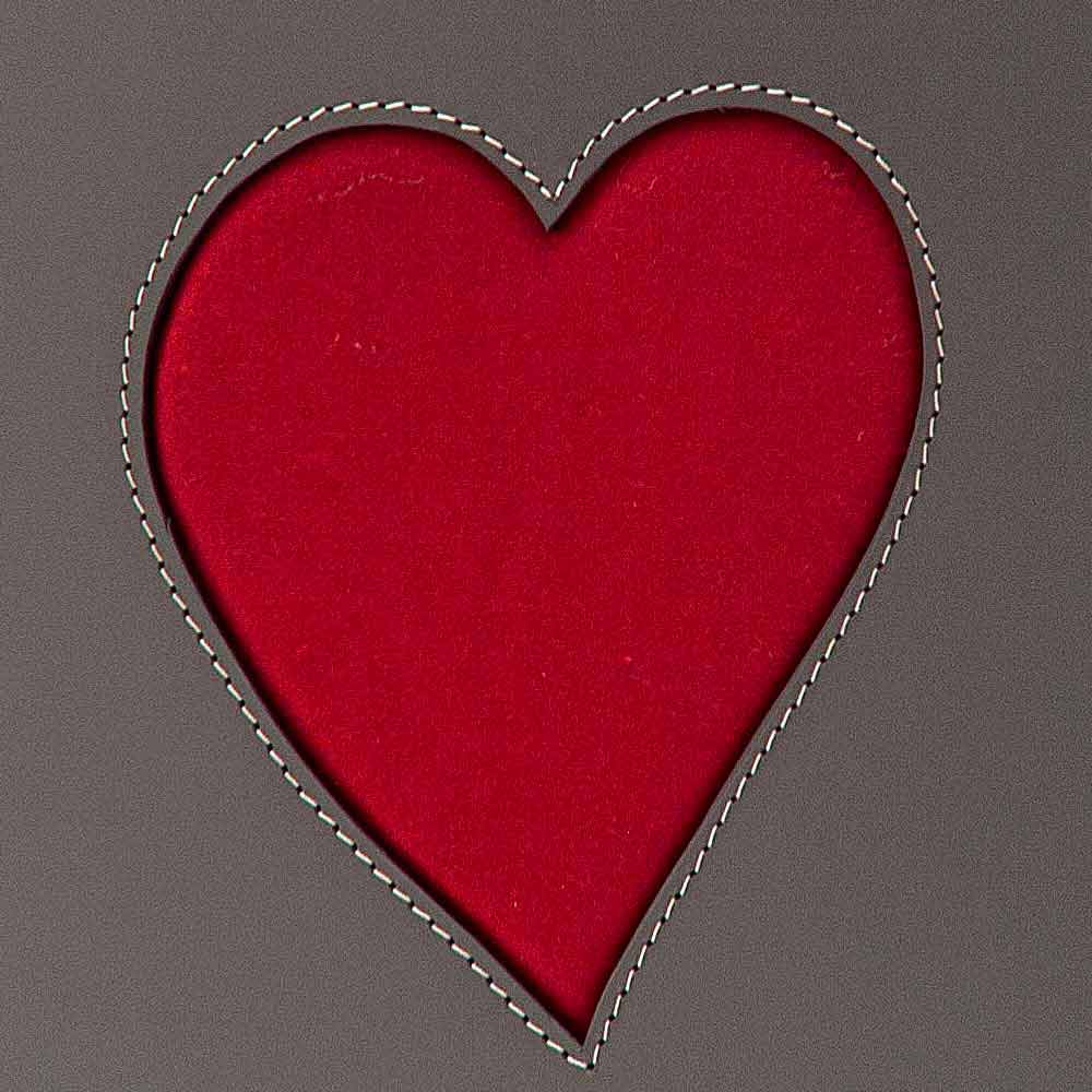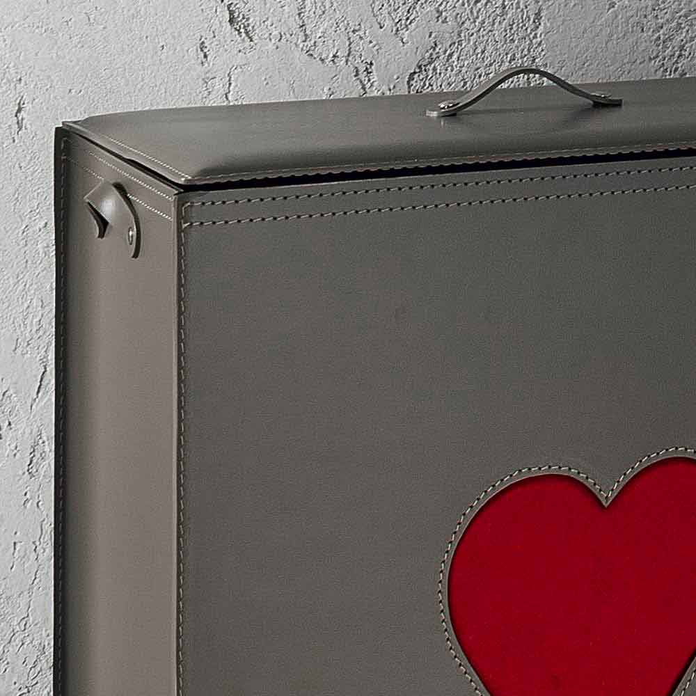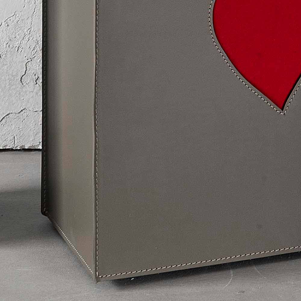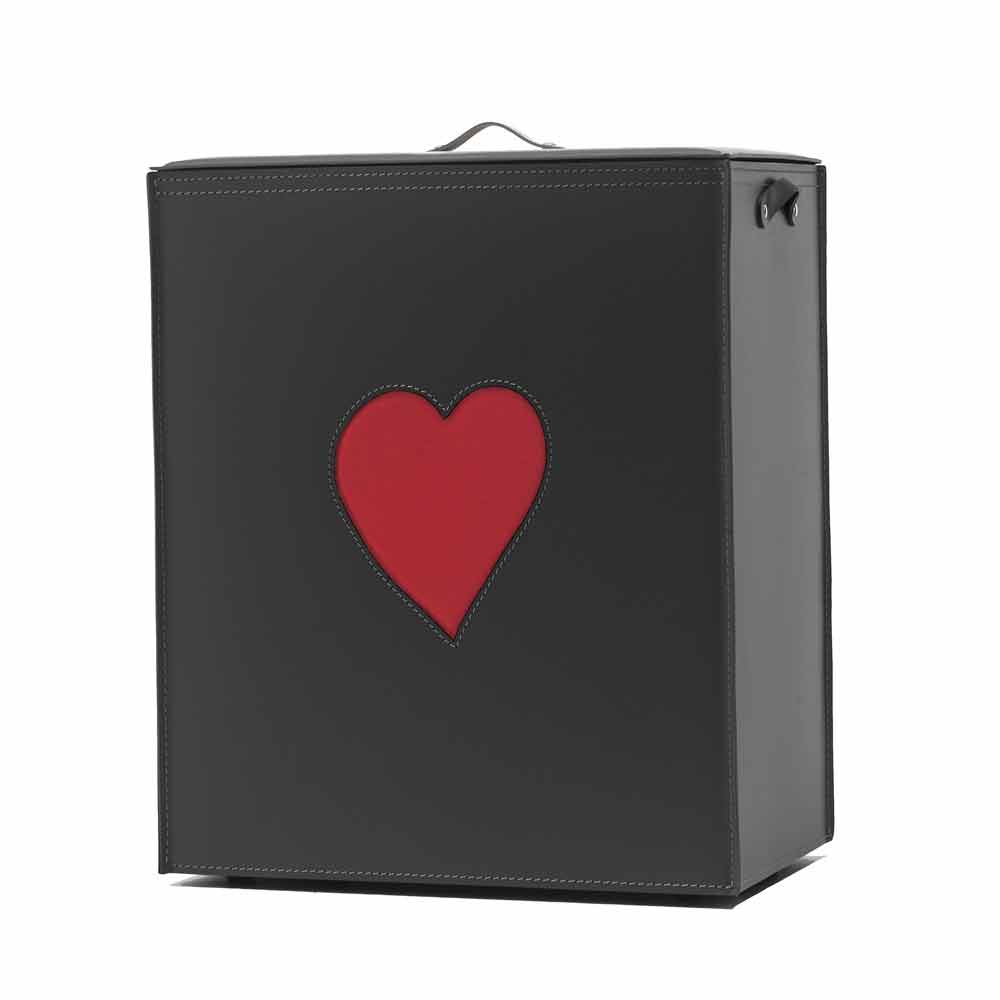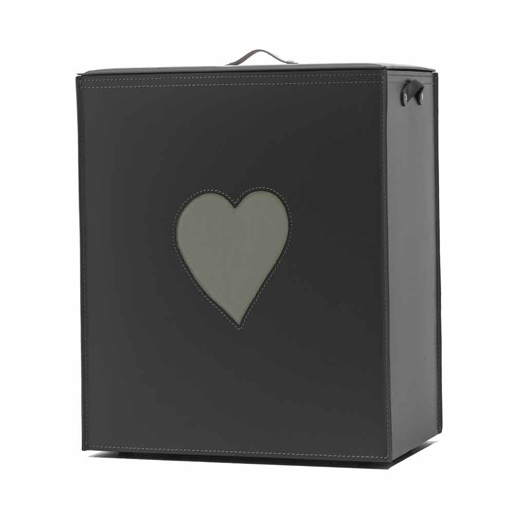 Prostokątny kosz na bieliznę, wykonany z regenerowanej skóry, zarówno wewnątrz, jak i na zewnątrz, z dekoracją w kształcie serca, wybraną z czerwonego lub ciemnoszarego koloru. Dno wykonane ze sklejki, również pokryte skórą. Wyposażone w praktyczne gumowe nóżki. Wewnątrz znajduje się odpinana bawełniana torba.