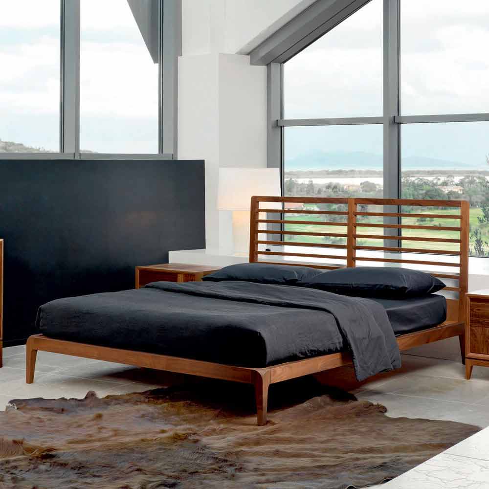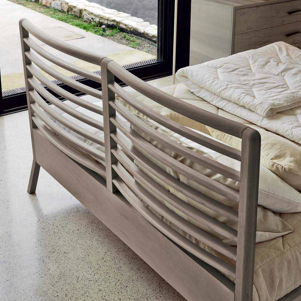 W tym rozwiązaniu najbardziej harmonijne łóżko oferuje wyściełany zagłówek, ozdobiony szwami, które śledzą pionowe linie. Niezbędny i elegancki, wykonany jest z litego orzecha, wykończonego w oleju, do umieszczenia w najbardziej wyszukanych kontekstach wyposażenia.