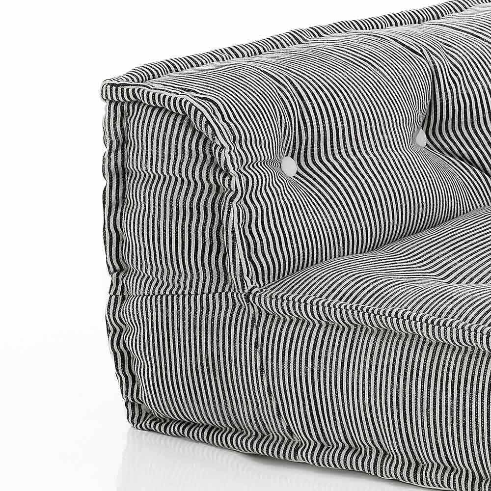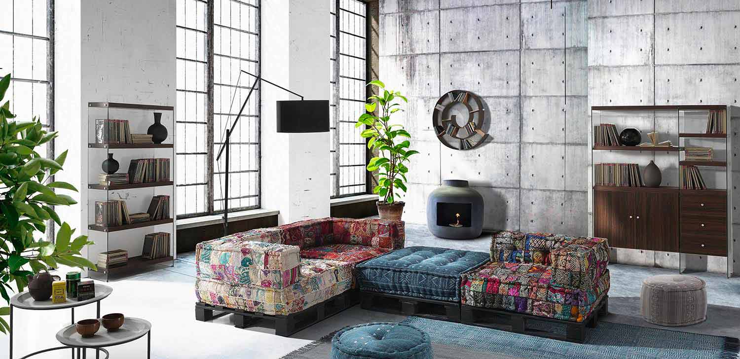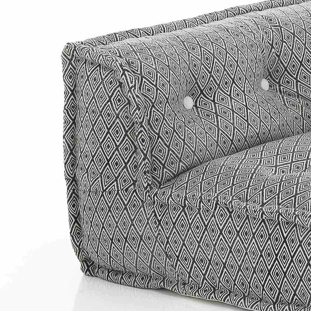 Tapicerowana sofa z patchworku i malowanego na czarno lub biało drewna o etnicznym designie.