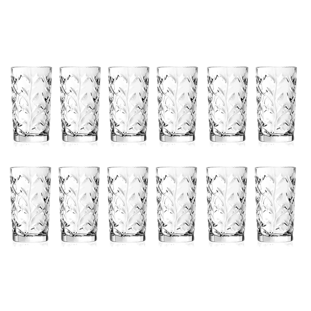 Wysokie szklanki typu tumbler z ekokryształu z dekoracją w liście, 12 sztuk wyprodukowane we Włoszech.