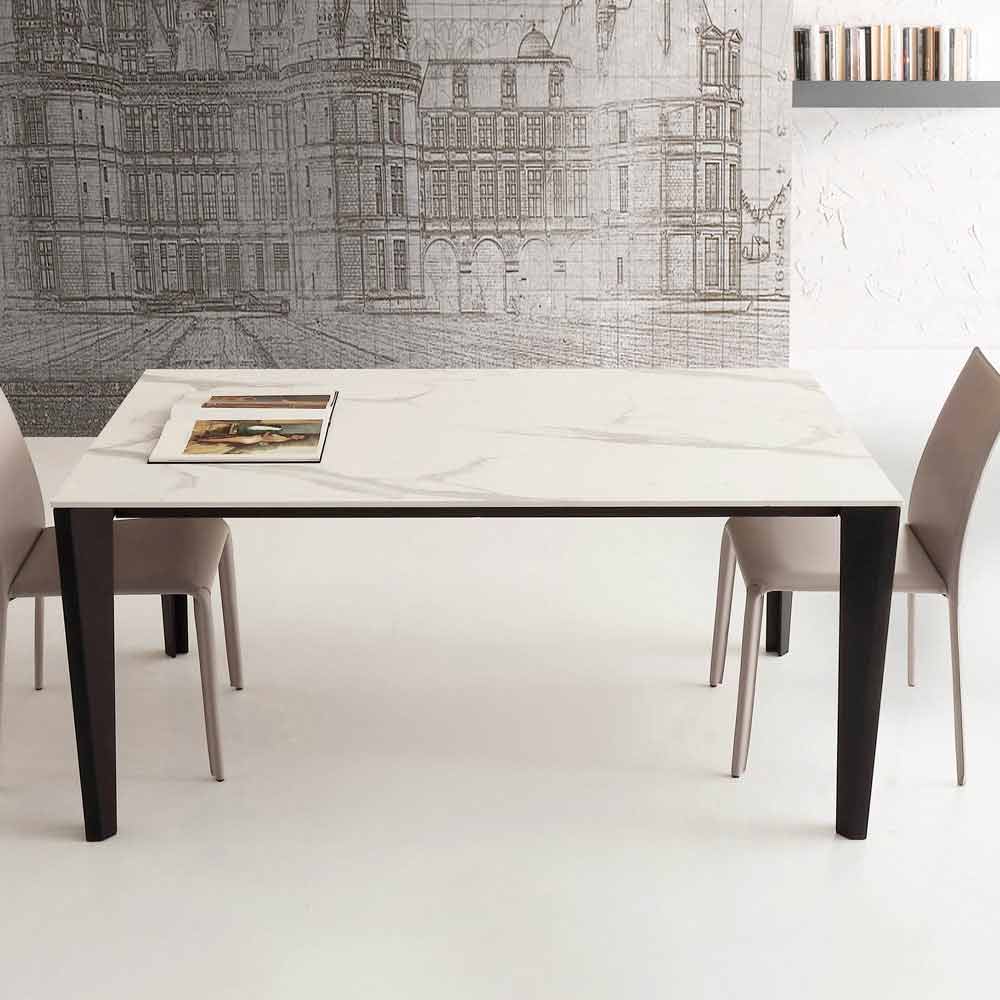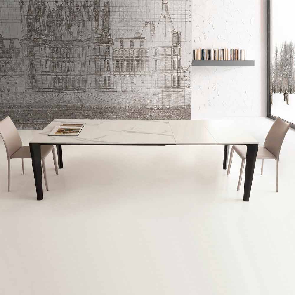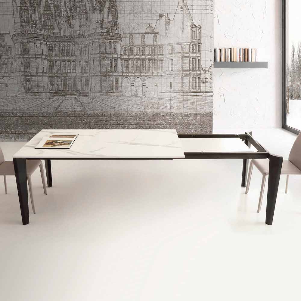 Stół do jadalni wykonany we Włoszech z wysuwanym blatem z ceramiki szklanej (o grubości 12 mm) z wykończeniem z białego marmuru Calacatta, przedłużeniem z białej melaminy i pomalowaną na czarno metalową podstawą.