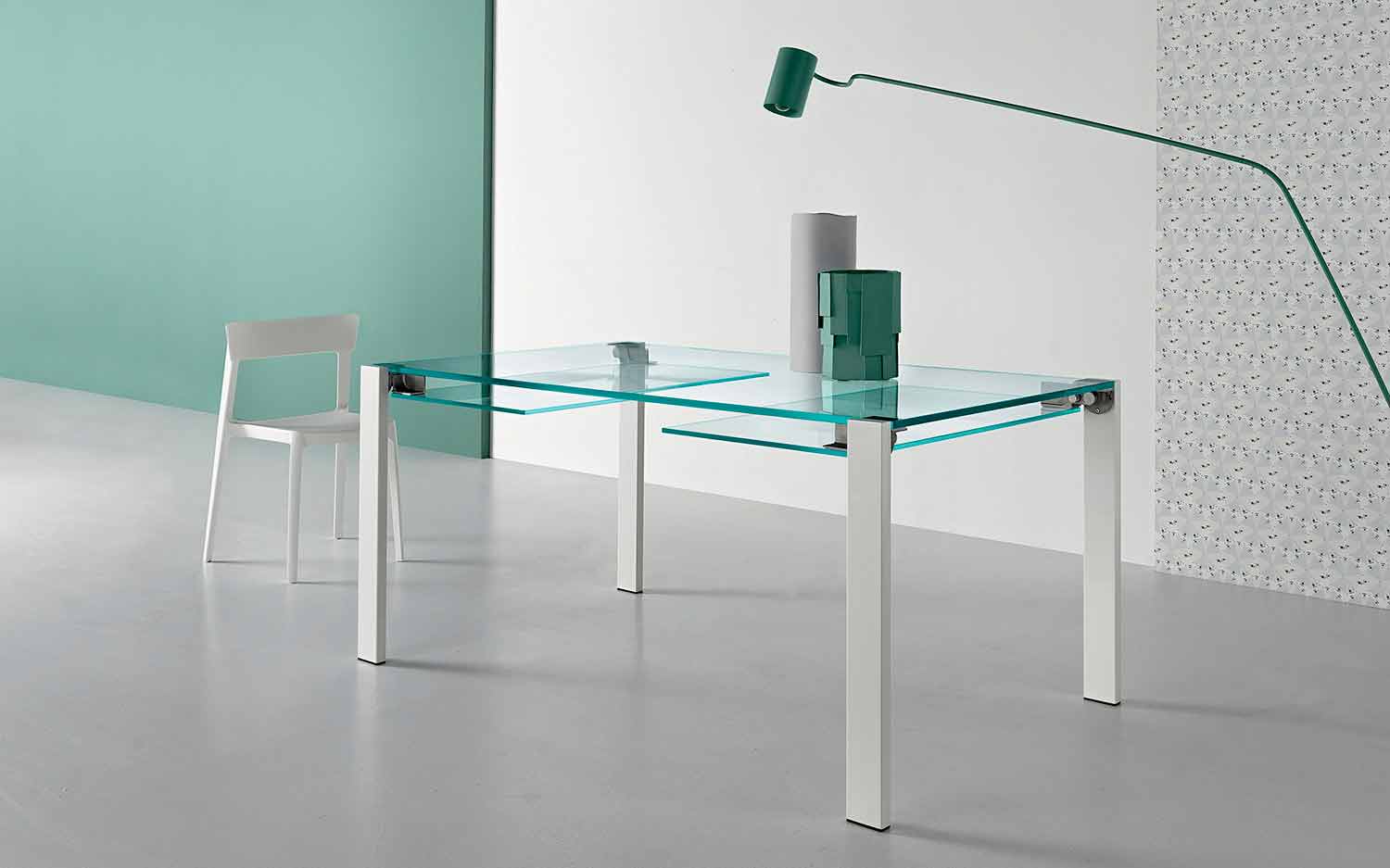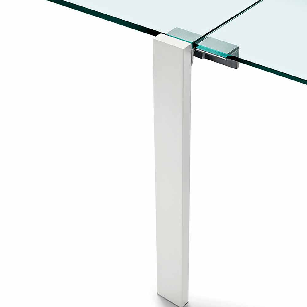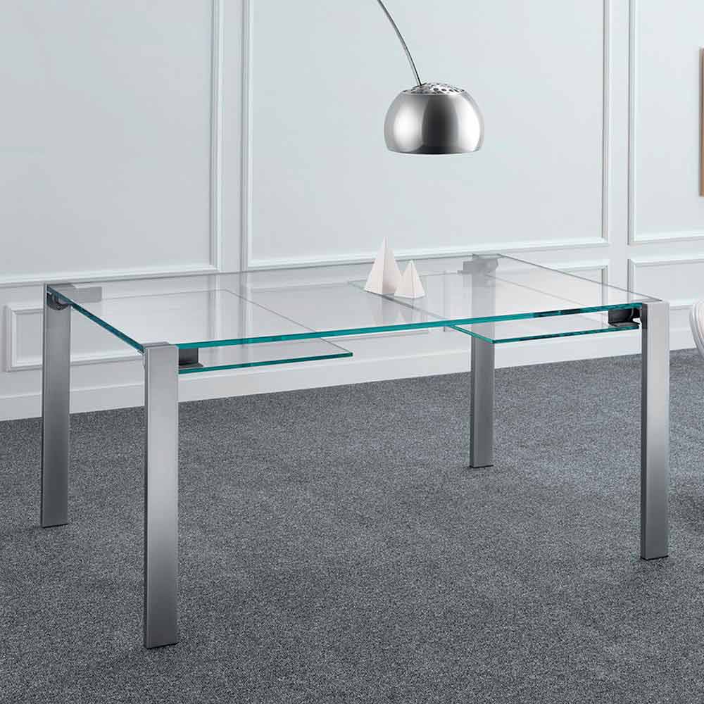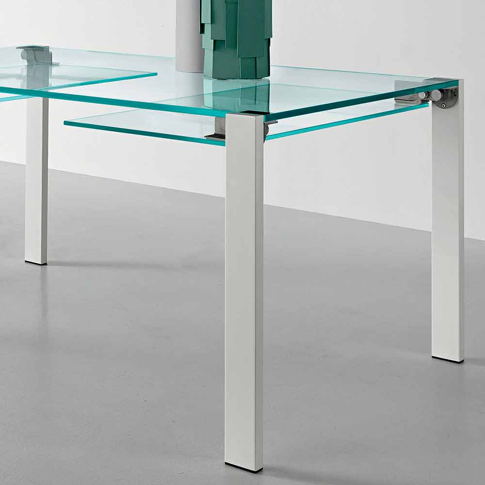 Bardzo przezroczysty szklany stolik z możliwością przedłużenia do 280 cm z chromowaną lub malowaną na biało metalową podstawą, wyprodukowany we Włoszech.