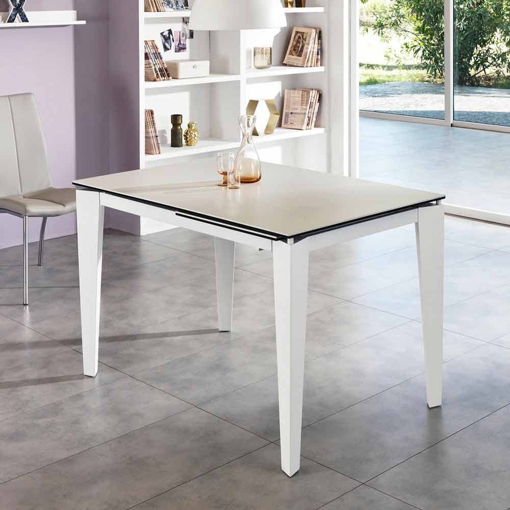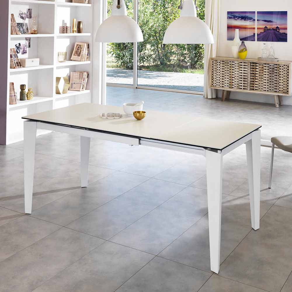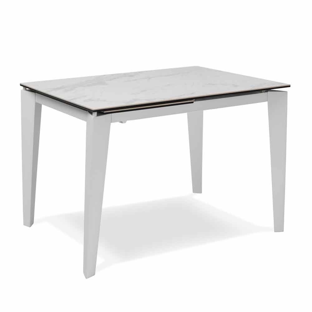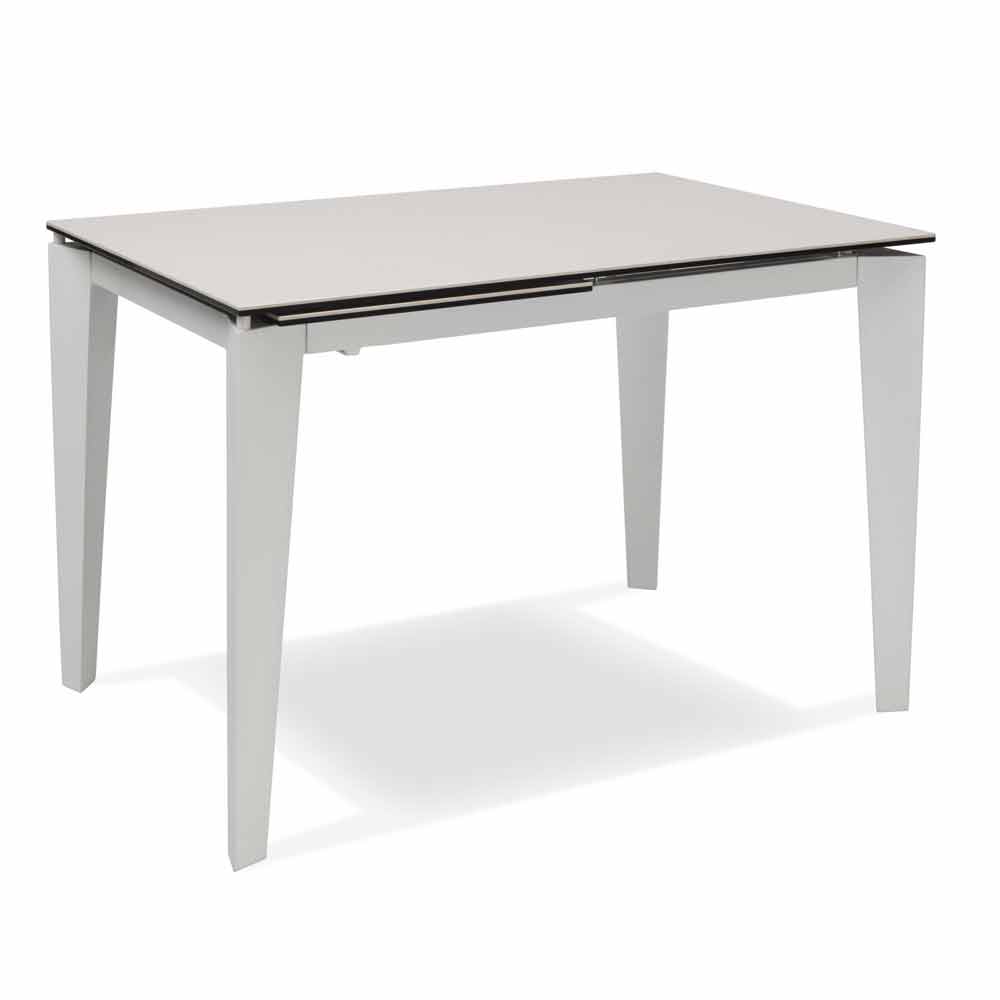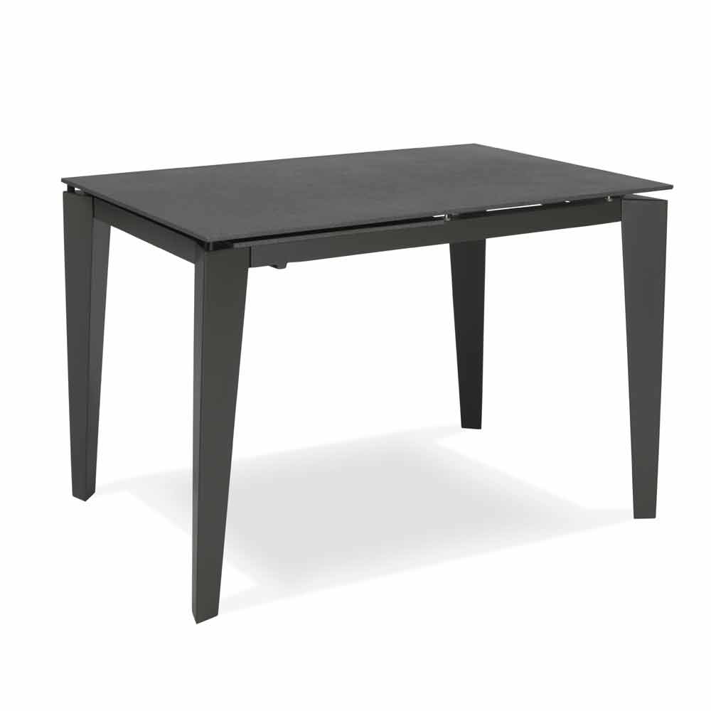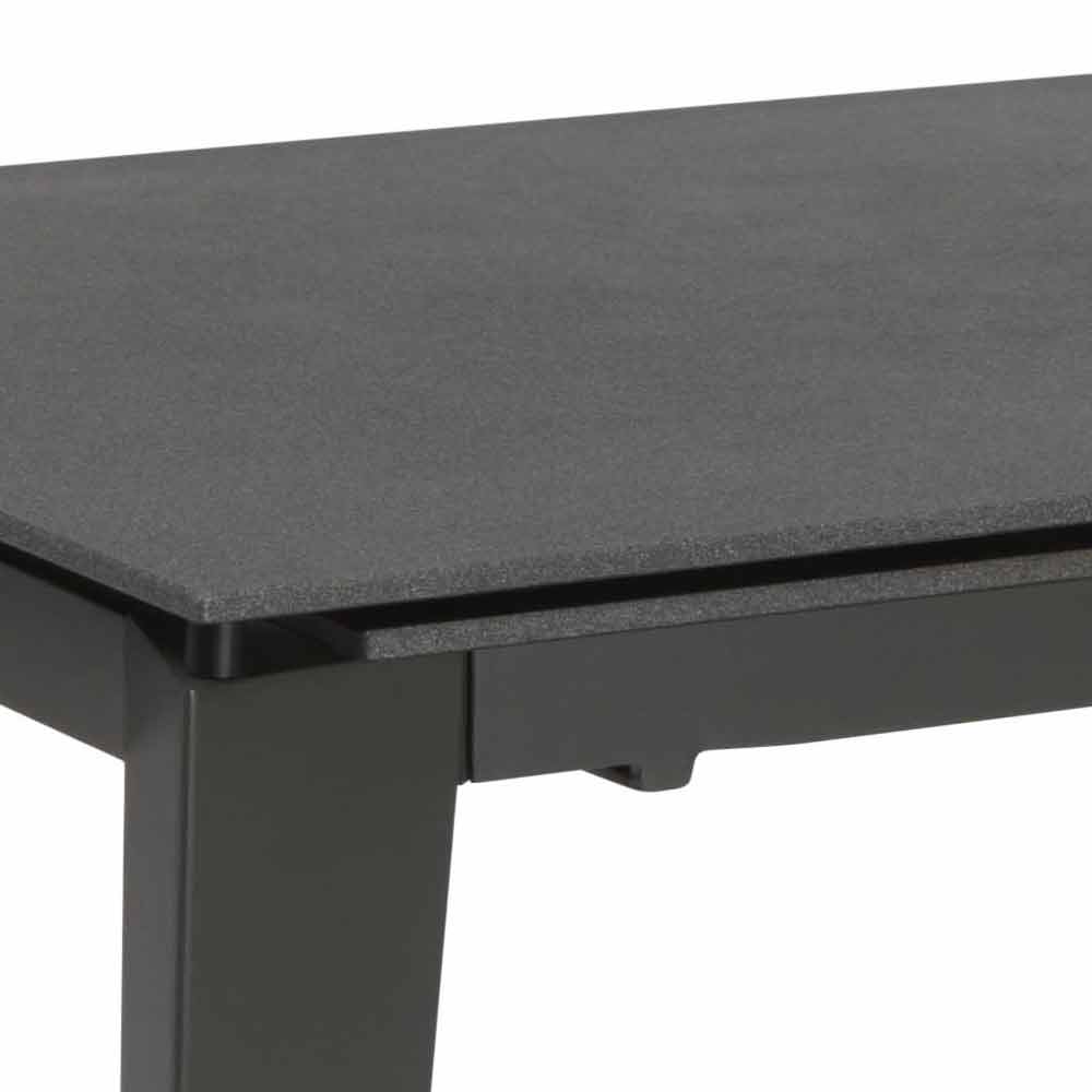 Rozkładany prostokątny stół z matowo malowaną metalową podstawą. Wierzch i przedłużenie ze szkła i ceramiki (dolna warstwa ze szkła, górna warstwa z ceramiki). Dzięki praktycznemu przedłużeniu istnieje możliwość przedłużenia stołu do długości 170 cm.