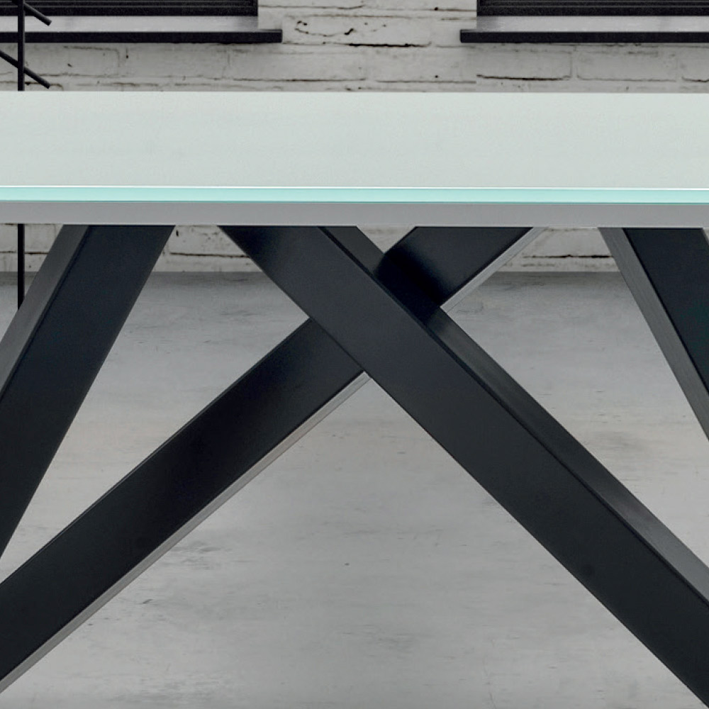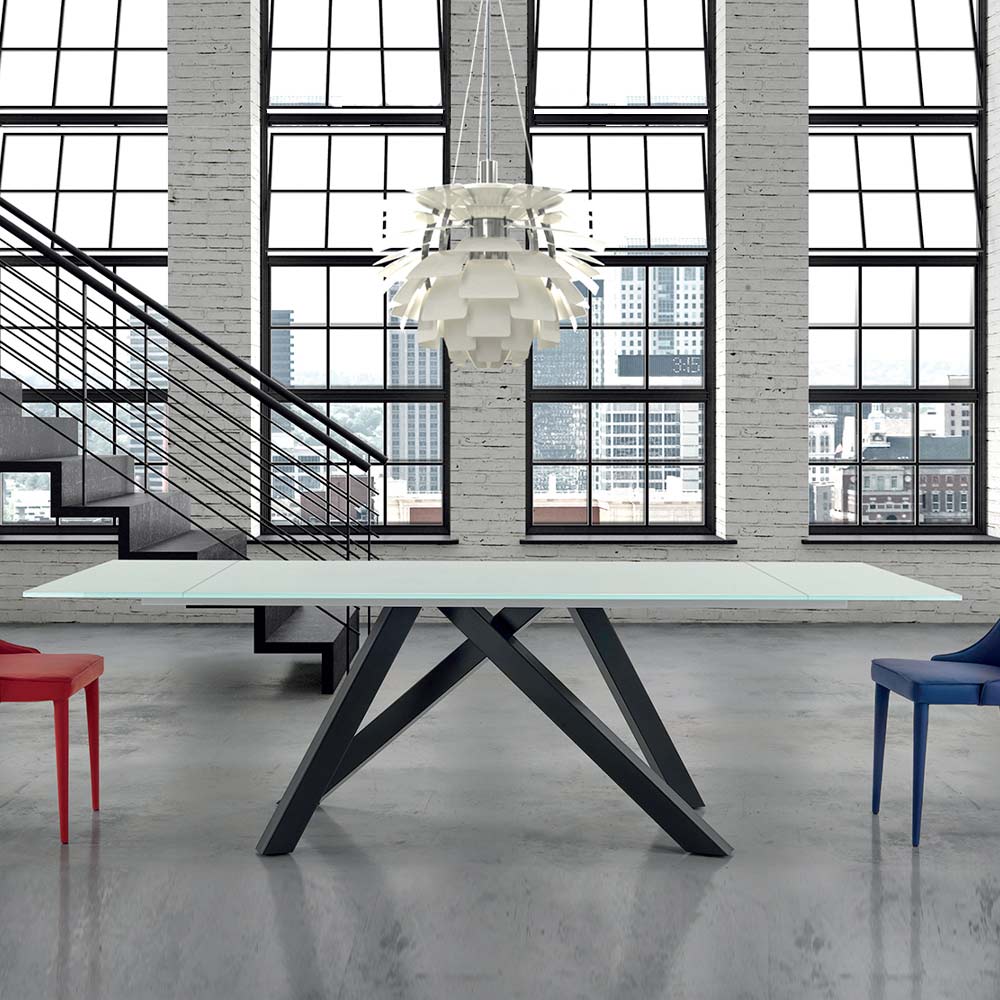 Rozkładany stół kuchenny do 278 cm ze szklanym blatem i czarną stalową podstawą wyprodukowaną we Włoszech.