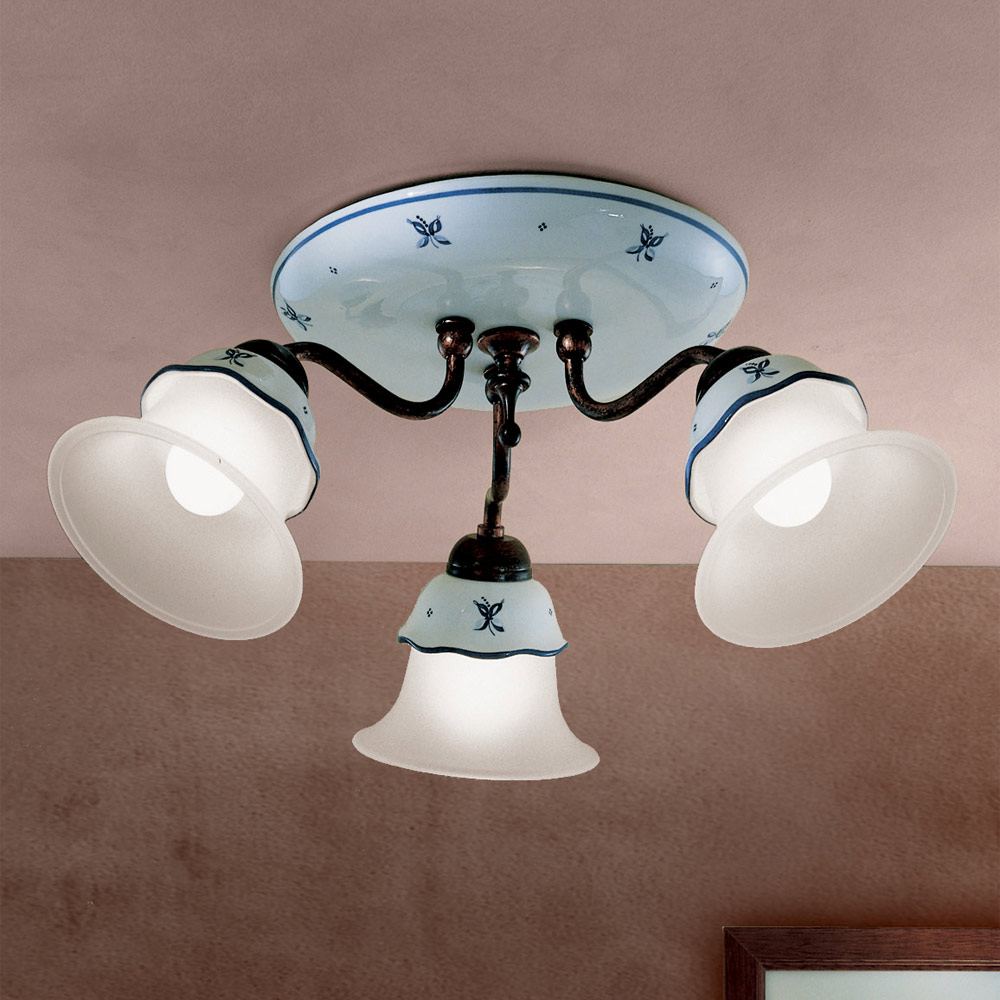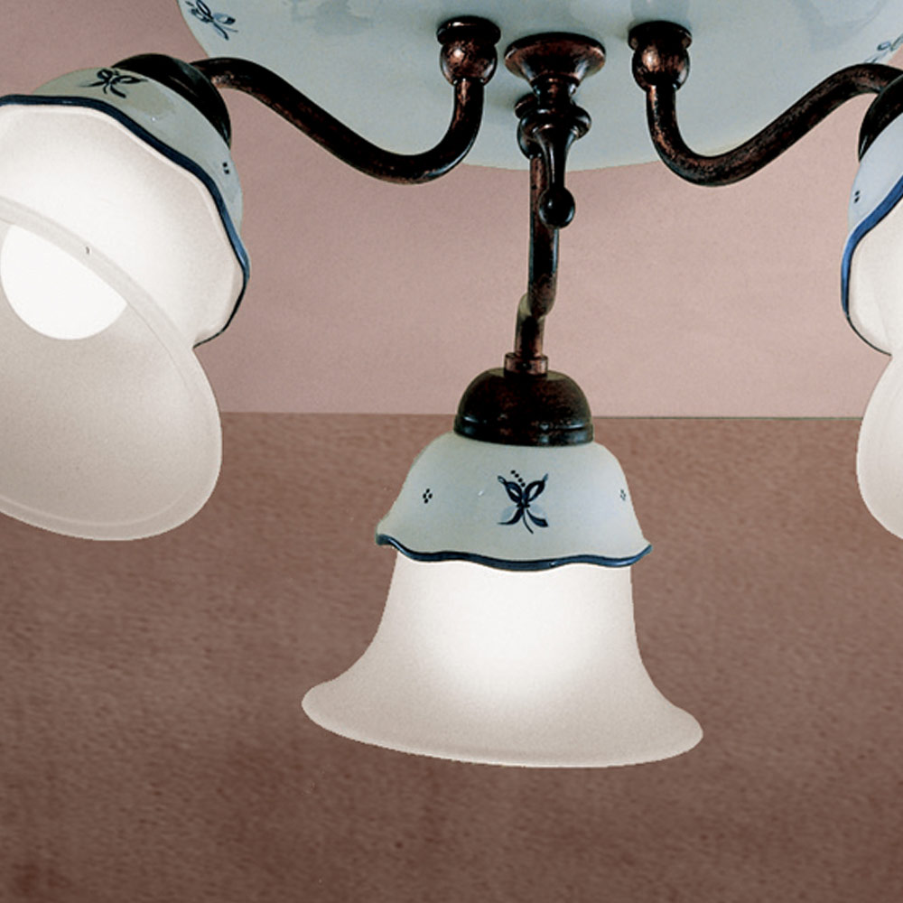 Lampa sufitowa z żelaza, ręcznie zdobionej ceramiki i szkła trawionego kwasem wyprodukowana we Włoszech przez Ferroluce.