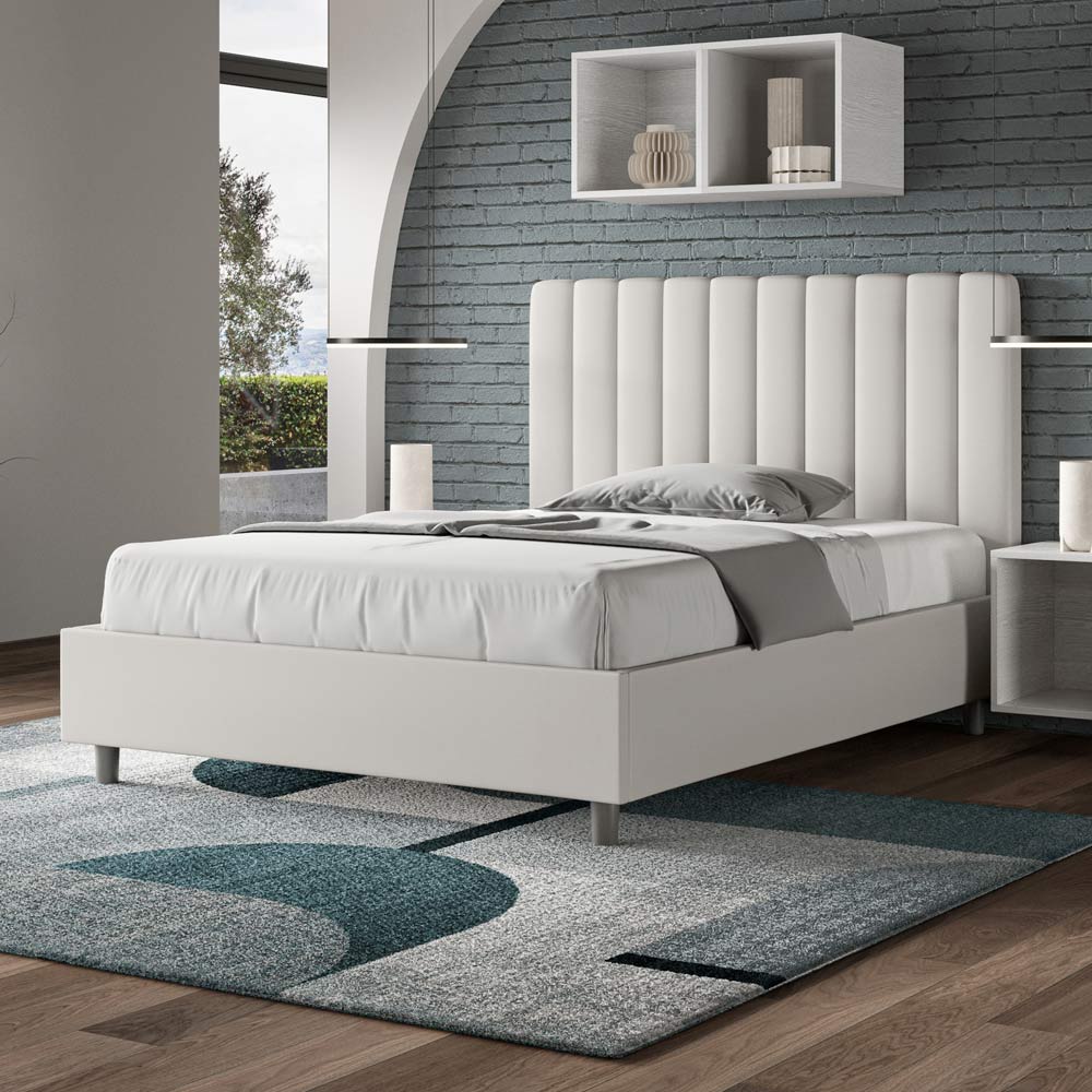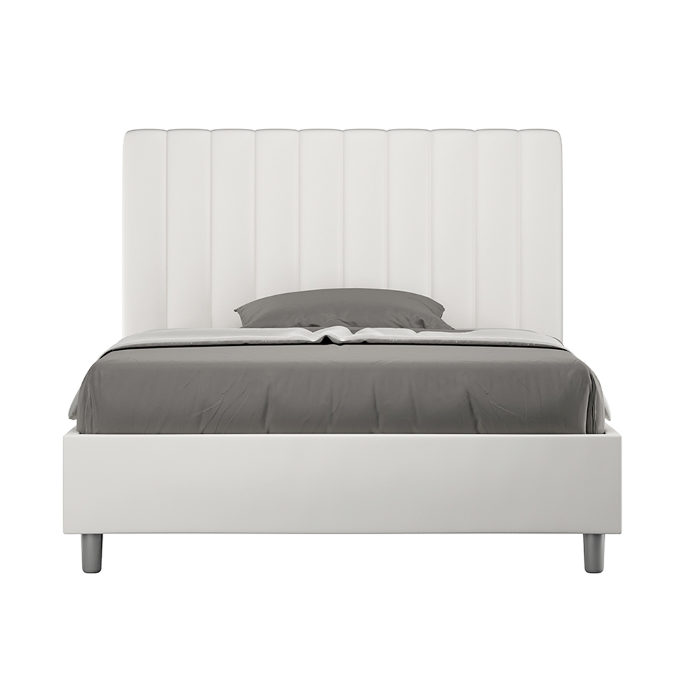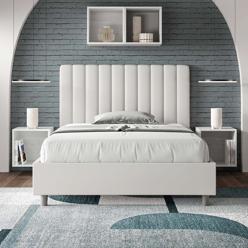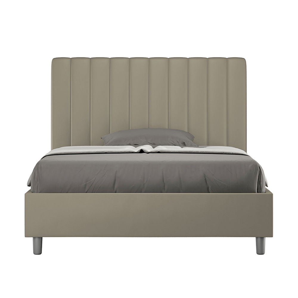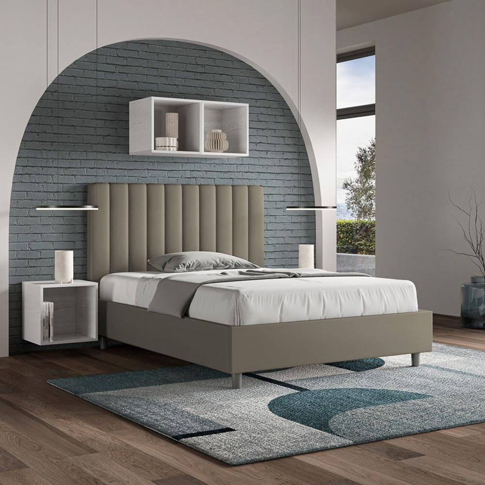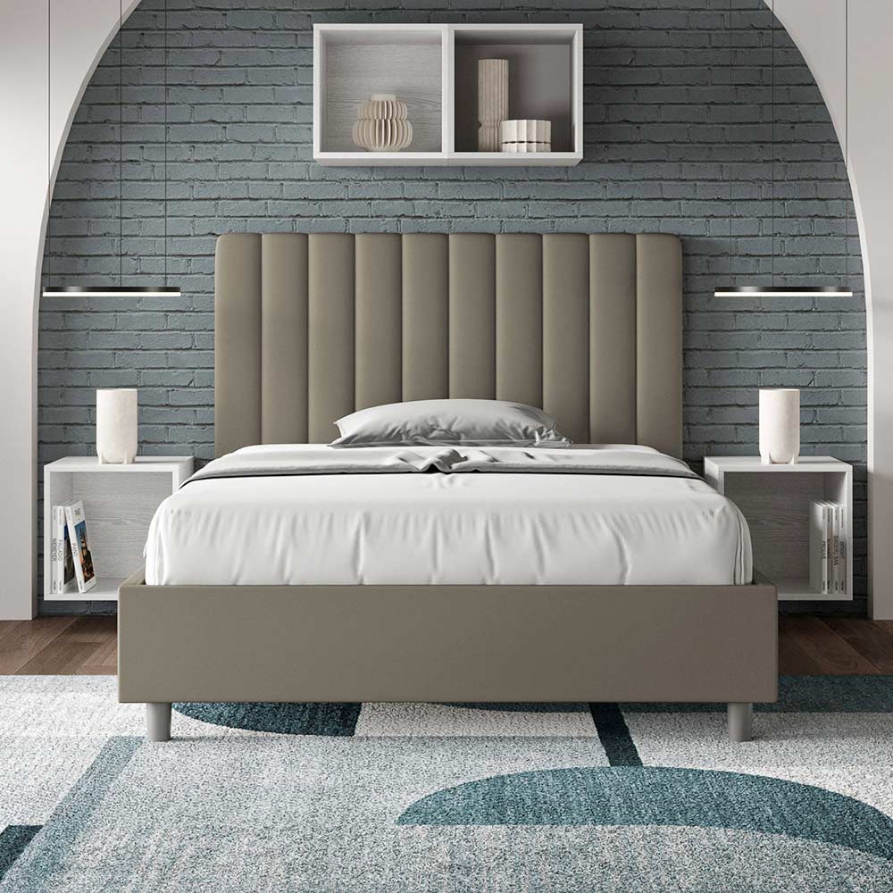Łóżko małżeńskie o wymiarach 120x200 cm , wykonane z płyty wiórowej i pokryte sztuczną skórą , w całości wyprodukowane we Włoszech. To łóżko typu queen-size z tapicerowaną ramą jest idealne dla osób poszukujących wyrazistego, ale nie przytłaczającego elementu wystroju. Łóżko charakteryzuje się minimalistycznym wezgłowiem z delikatnym pikowaniem o symetrycznych, pionowych liniach , które doskonale wpasowuje się w każde wnętrze, zarówno nowoczesne, jak i klasyczne. Tapicerka ze sztucznej skóry nadaje wnętrzu ciepły, przytulny charakter. Szczególnie dobrze sprawdza się w dobrze oświetlonych pomieszczeniach, ponieważ materiał zachowuje swój kolor nawet po długotrwałym nasłonecznieniu.