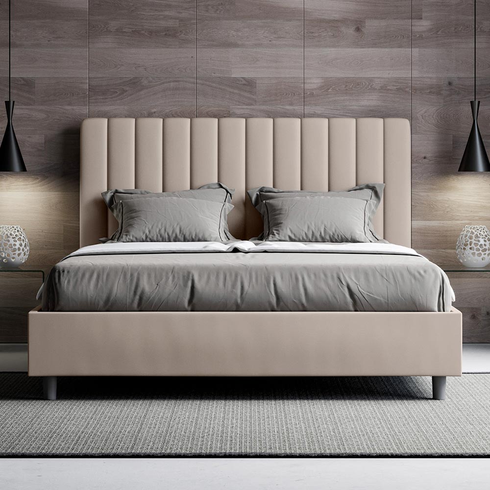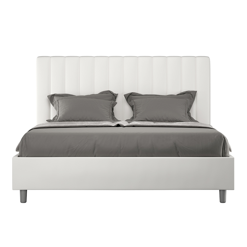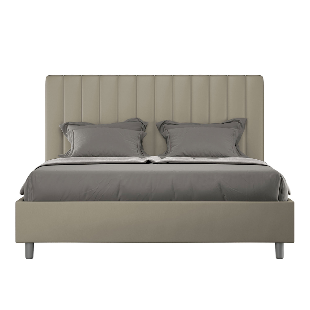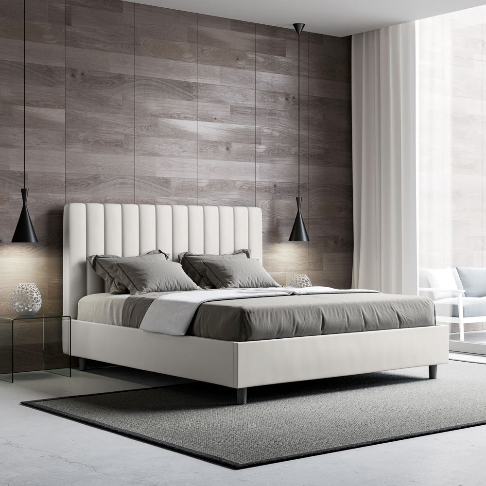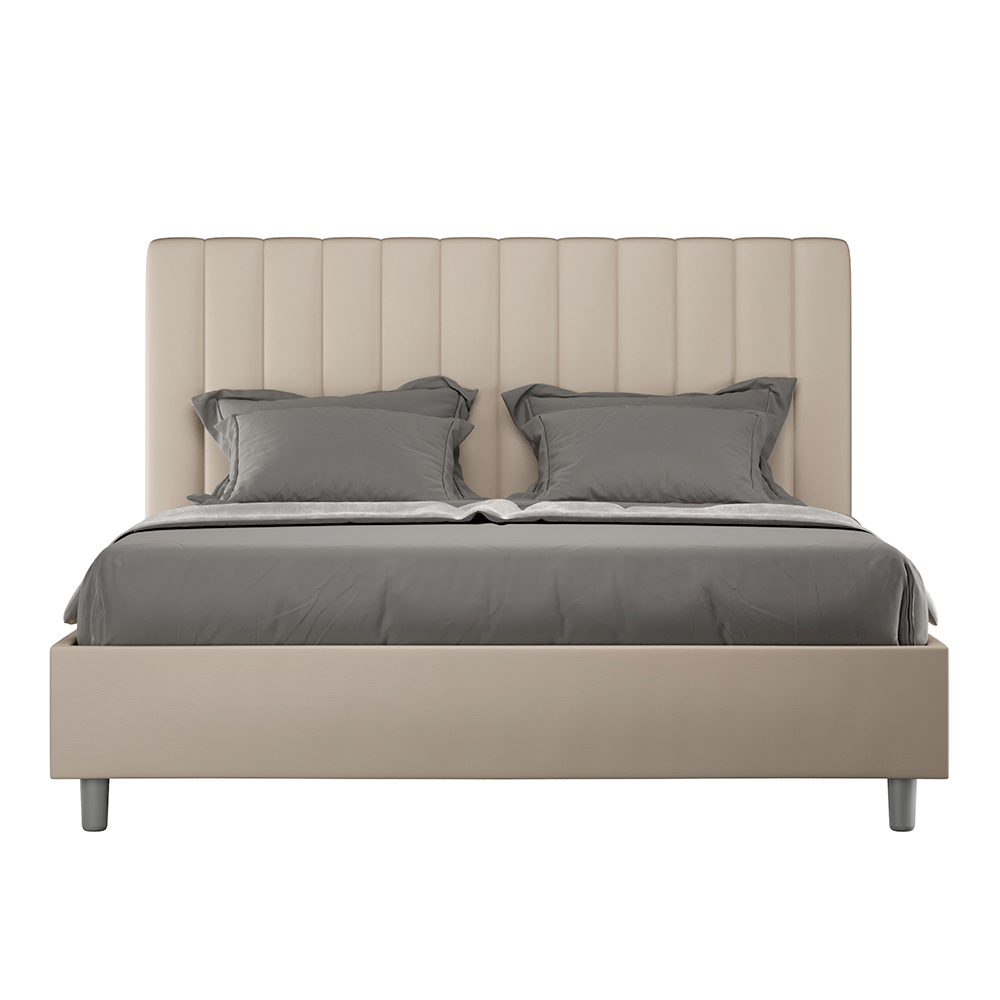 Łóżko dwuosobowe z wyściółką o wymiarach 160x200 cm , wykonane z płyty wiórowej i pokryte sztuczną skórą , w całości wyprodukowane we Włoszech. To łóżko podwójne z tapicerowaną ramą jest idealne dla osób poszukujących wyrazistego, ale nie przytłaczającego elementu wystroju. Łóżko charakteryzuje się minimalistycznym zagłówkiem z delikatnym pikowaniem o symetrycznych, pionowych liniach, który doskonale wpasuje się w każde wnętrze, zarówno nowoczesne, jak i klasyczne. Tapicerka ze sztucznej skóry nadaje wnętrzu ciepły i przytulny charakter. Łóżko to doskonale sprawdza się w dobrze oświetlonych pomieszczeniach, ponieważ materiał zachowuje swój kolor nawet po długotrwałym narażeniu na działanie promieni słonecznych.