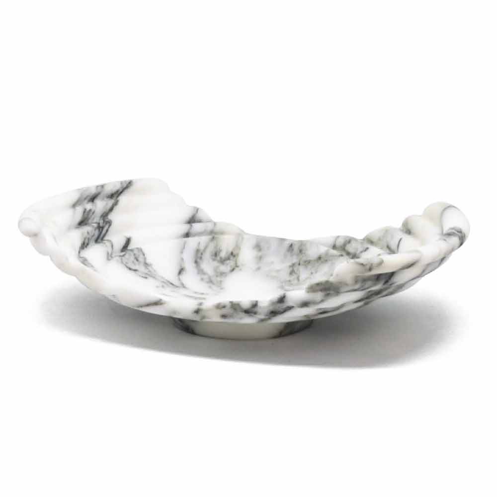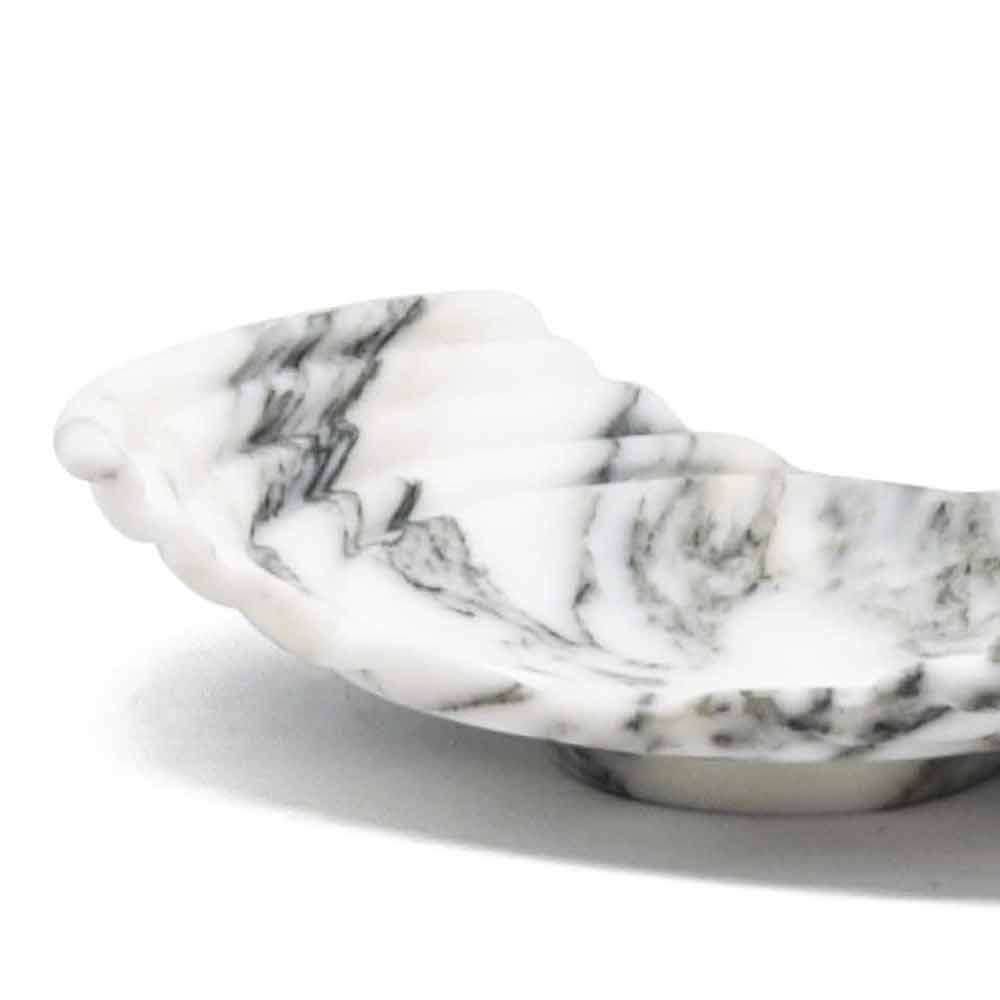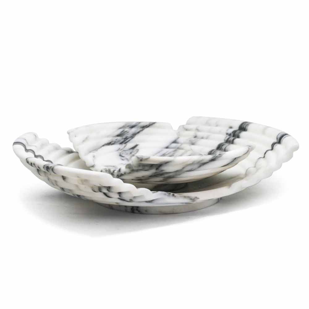 Dekoracyjna taca wykonana w całości z marmuru arabeskowego, odmiany drobnego białego marmuru z ciemnoszarymi żyłkami, zwanymi „arabeskami”.
