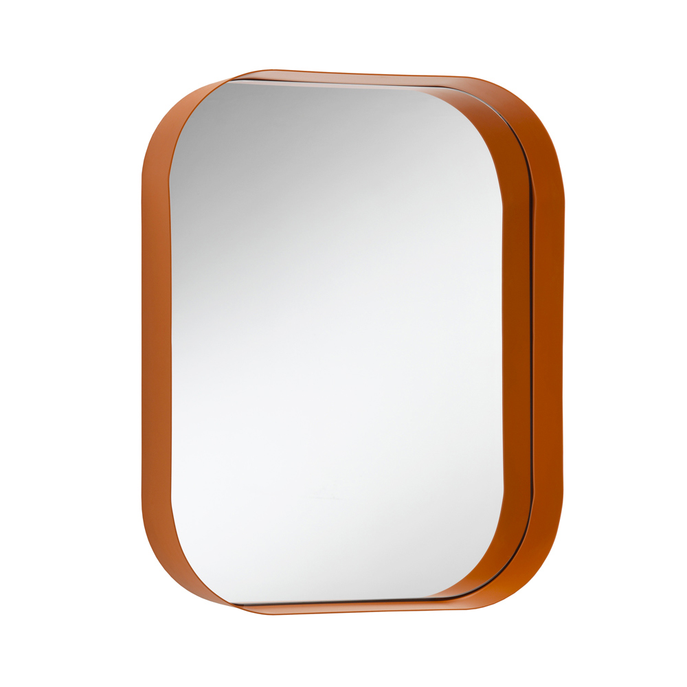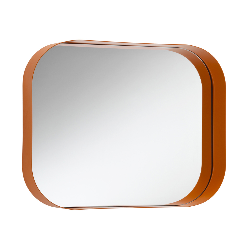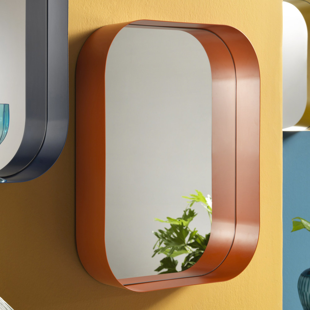 To duże i ładne lustro ścienne o prostokątnym kształcie z zaokrąglonymi narożnikami charakteryzuje się metalową krawędzią, która otacza lustro i pełni funkcję praktycznej i kolorowej półki o szerokości 12,50 cm.