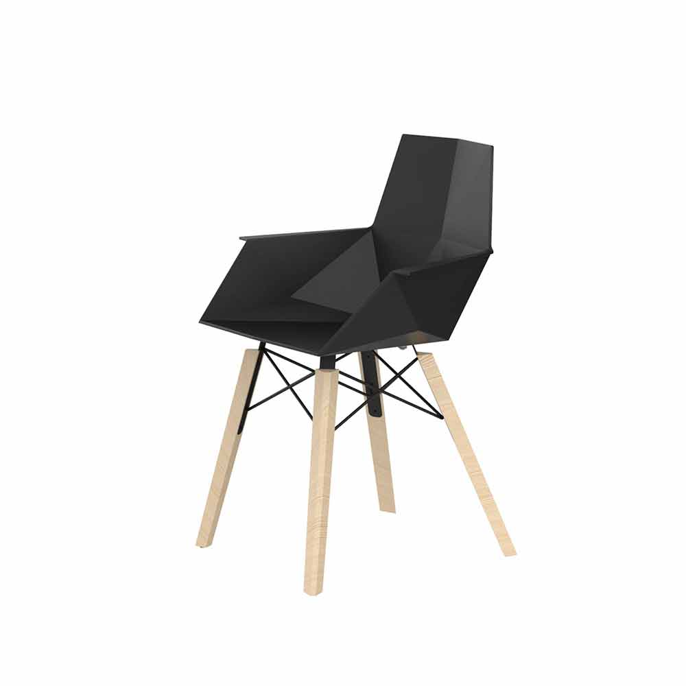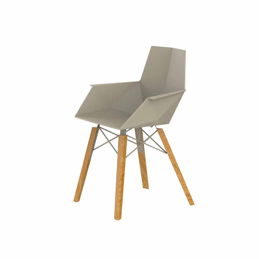 Designerski fotel z polipropylenu ze strukturą z drewna jesionowego i siedziskiem i oparciem z polipropylenu w różnych kolorach.