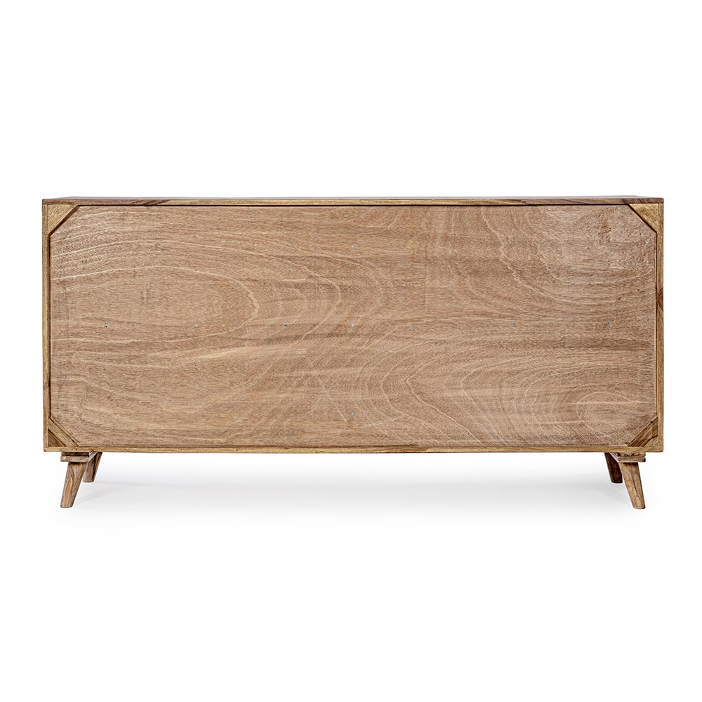 Ten designerski kredens do salonu ma strukturę drewna sheesham , z tyłu ze sklejki i dnem szuflad.
