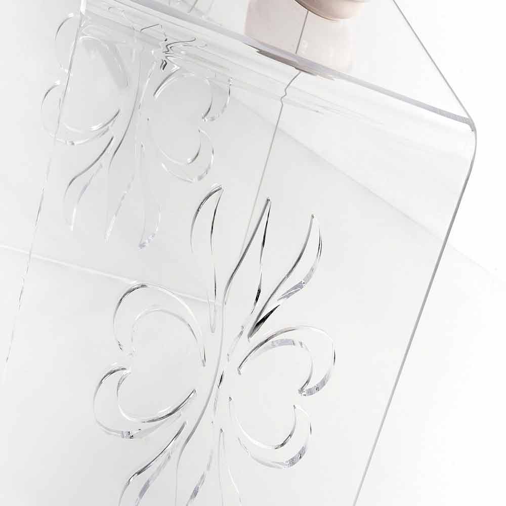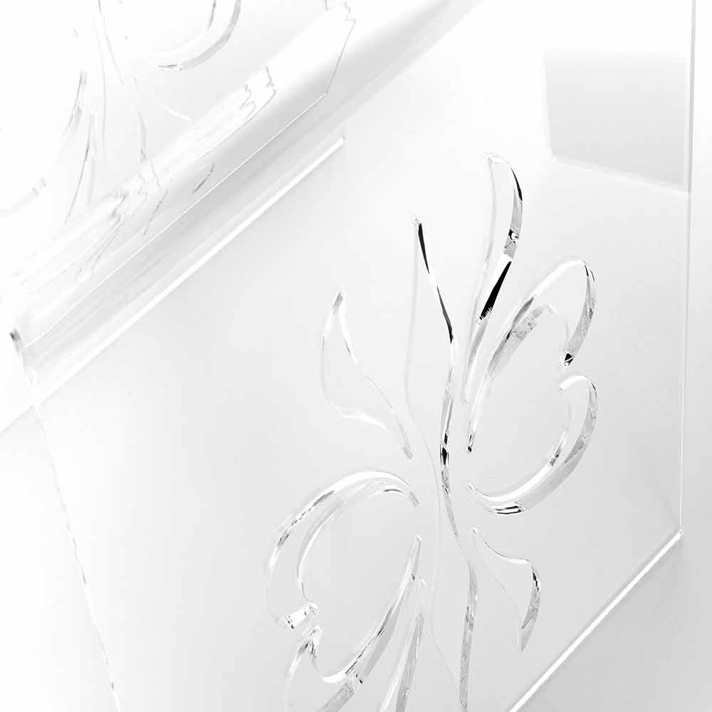 Mandas to mały stół wykonany z najczystszego kryształu akrylowego, ozdobiony bocznymi nakładkami zręcznie wykonanymi z dokładnością cięcia laserowego. Wysoka jakość materiału i grubość stołu zwiększają jego blask. Idealnie umieszczony przed sofą, jest dyskretną i wyrafinowaną obecnością w każdej przestrzeni, zarówno klasycznej, jak i nowoczesnej.