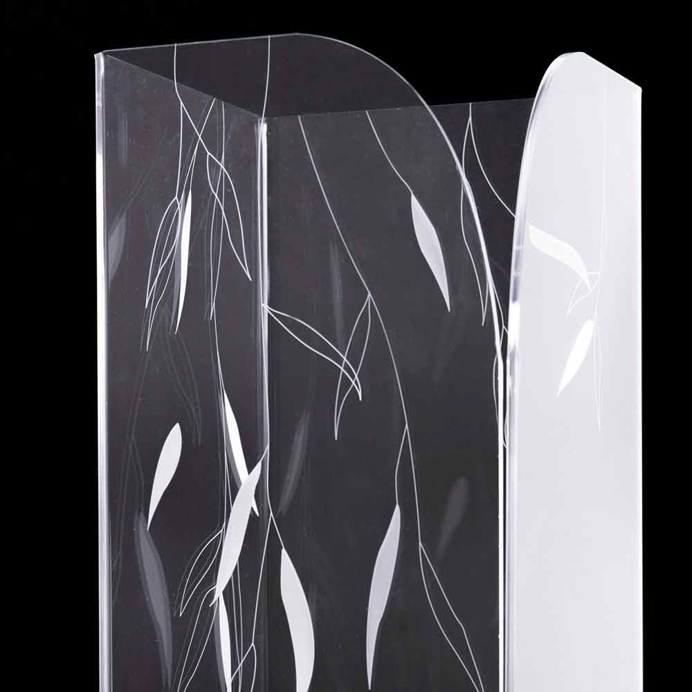 Stojak na parasole z przezroczystego tworzywa sztucznego z grawerowanymi laserowo ozdobnymi liśćmi, wykonany we Włoszech.