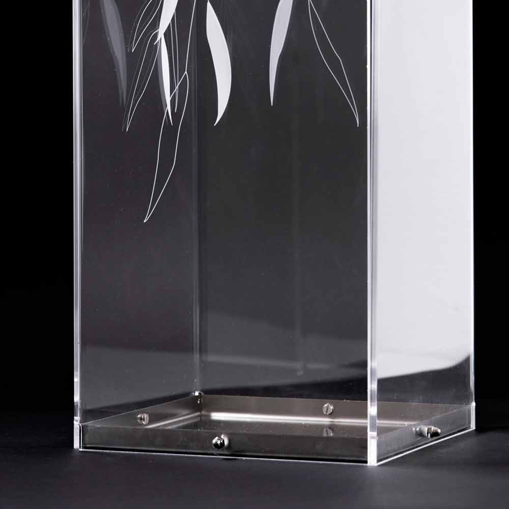 Stojak na parasole z przezroczystej pleksi charakteryzuje się laserowo znakowanymi zdobieniami liści i podstawy ze stali nierdzewnej.