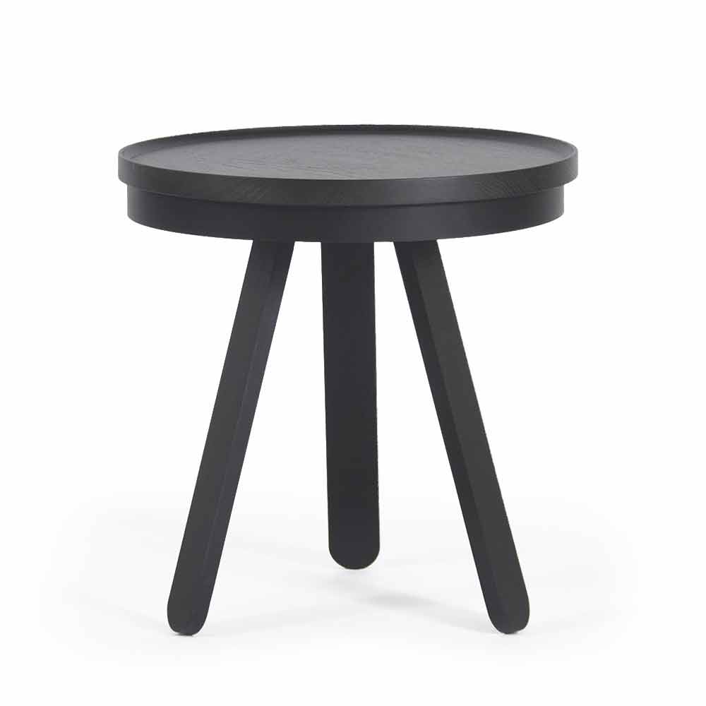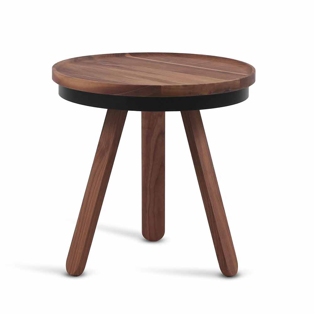 Stolik kawowy z litego drewna i stali z okrągłym blatem.