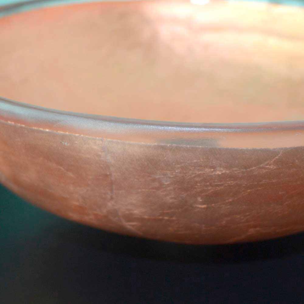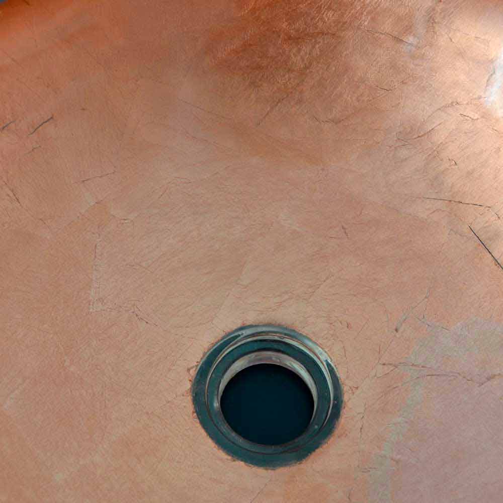 Umywalka wykonana z przezroczystej żywicy i miedzianego liścia.
