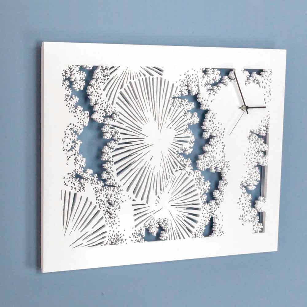 Duży zegar ścienny z drewna w kolorze białym lub gołębiej szarości, prostokątny i nowoczesny design, rzeźby laserowe wykonane we Włoszech.