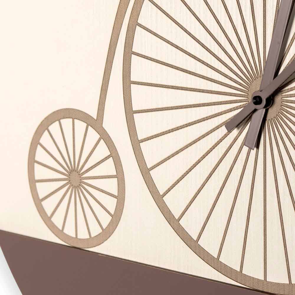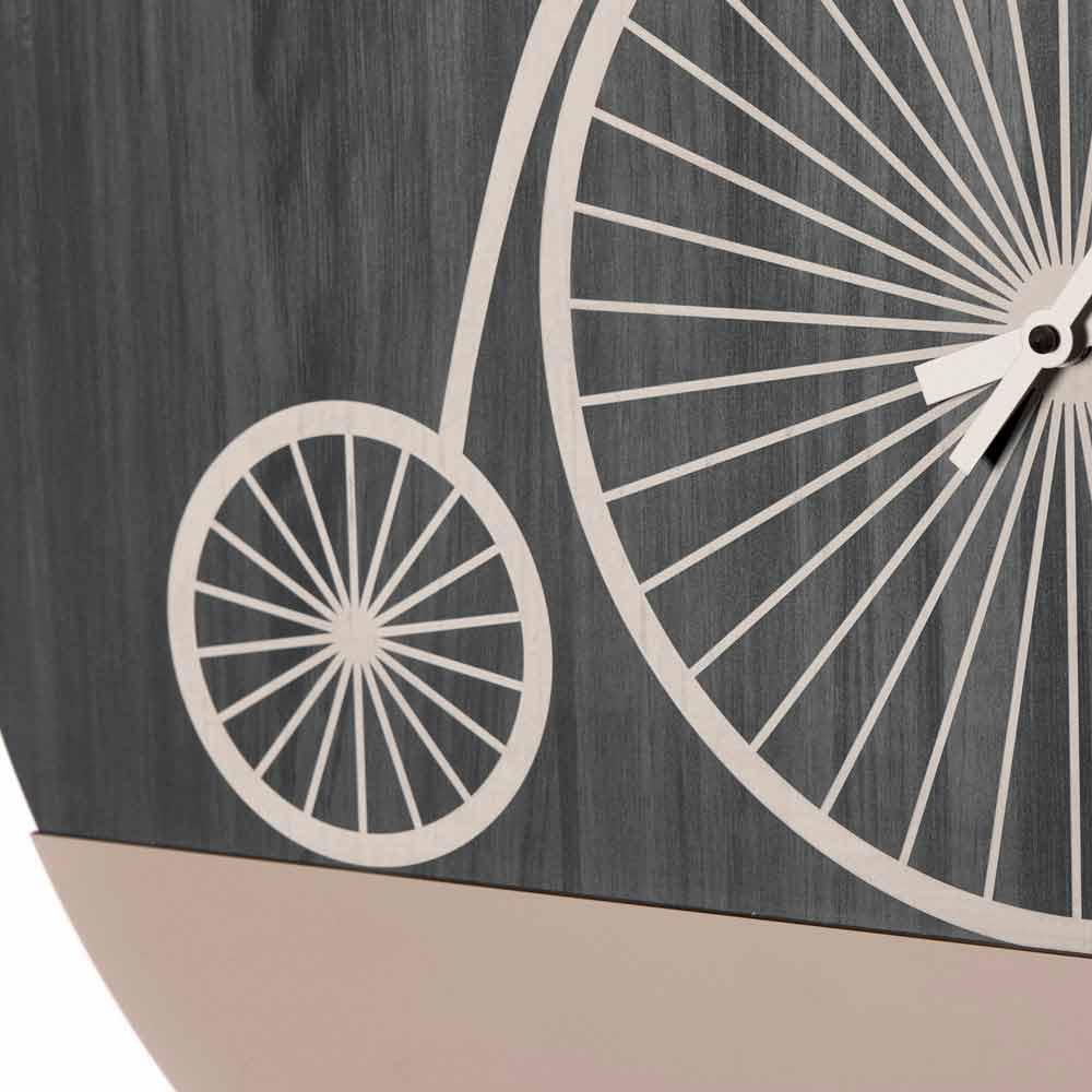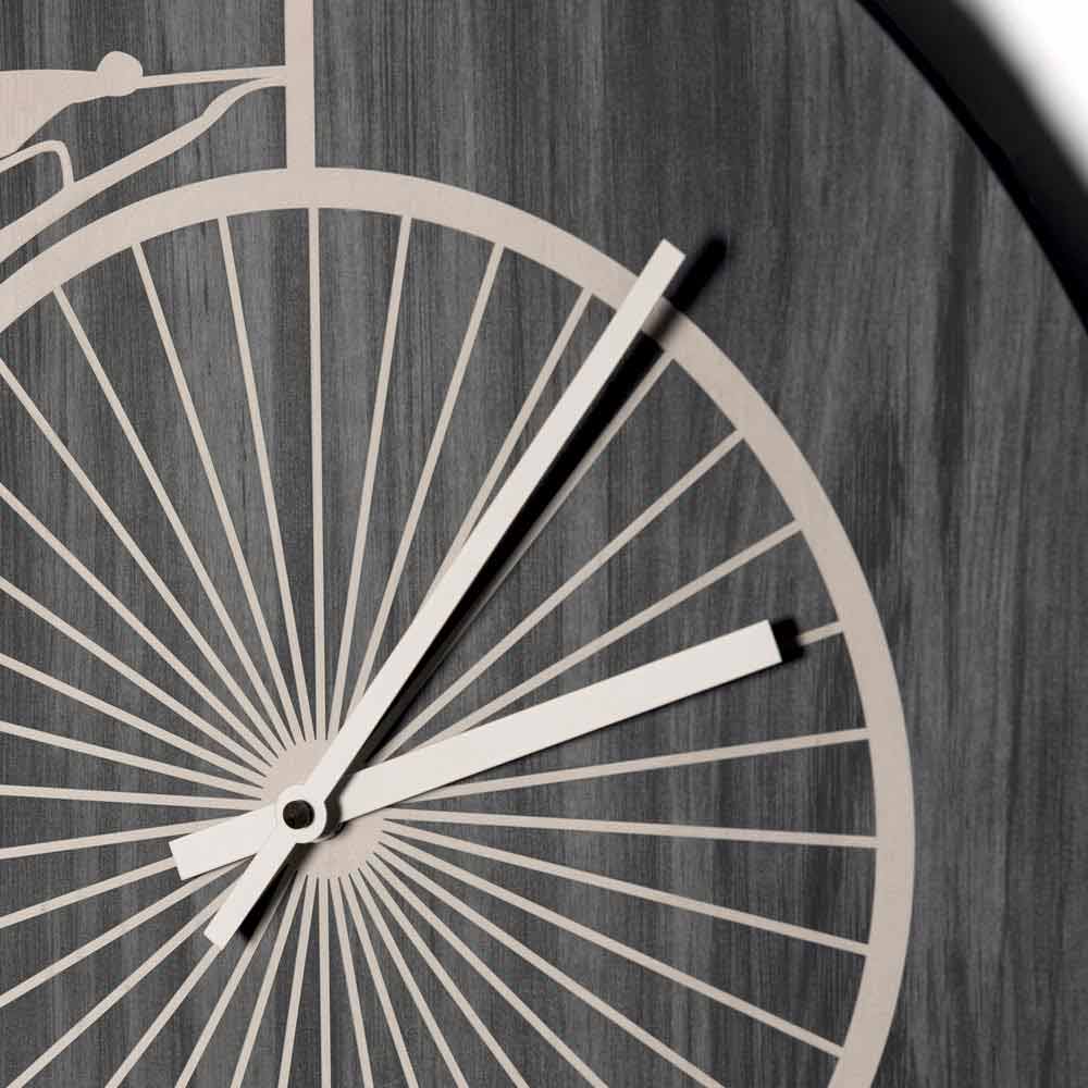 Zegar ścienny z drewna jesionowego lub tablicowego z laserową dekoracją roweru, wyprodukowany we Włoszech.