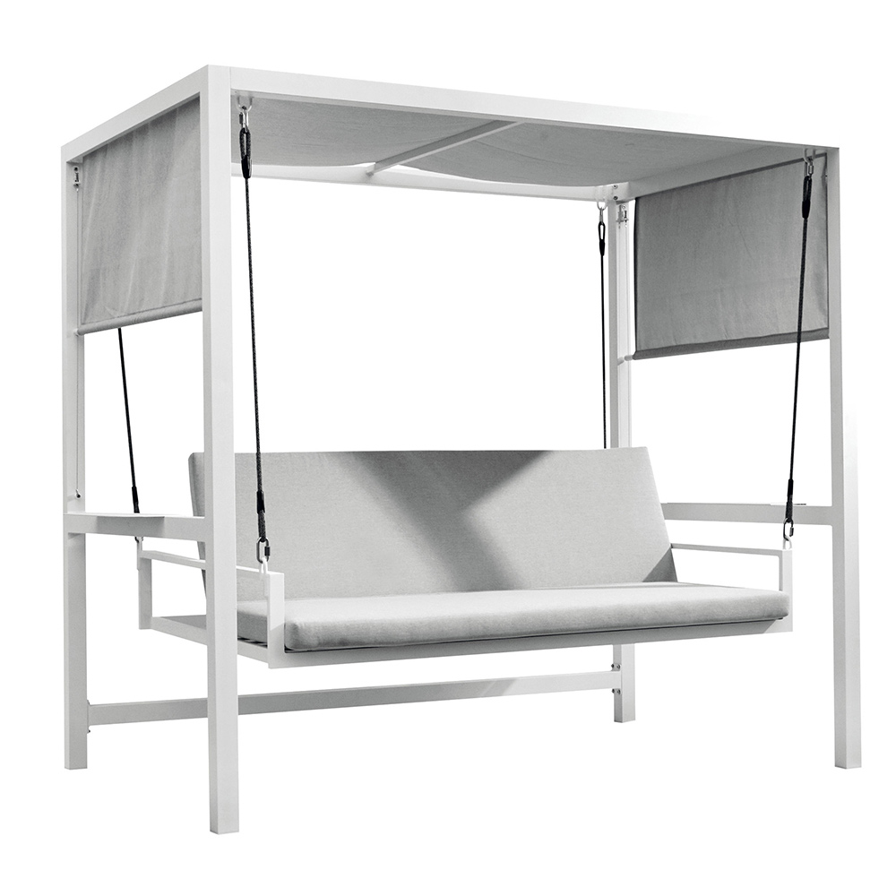 Huśtawka ogrodowa wykonana z aluminium malowanego na biało z poduszkami z tkaniny olefinowej 190 gr w kolorze jasnoszarym. Ta huśtawka zewnętrzna jest wyposażona w rozkładane oparcie , dzięki czemu idealnie nadaje się do tworzenia relaksującej atmosfery i spędzania wolnego czasu na świeżym powietrzu. Huśtawka zewnętrzna uosabia sztywne i wytrzymałe konstrukcje oraz czyste i proste linie, które czynią ją wyrafinowaną i idealną do odpoczynku i relaksu w każdym środowisku zewnętrznym. Zastosowanie aluminium do konstrukcji podnosi solidność i funkcjonalność tego produktu, odpornego na uderzenia i zmiany klimatyczne.