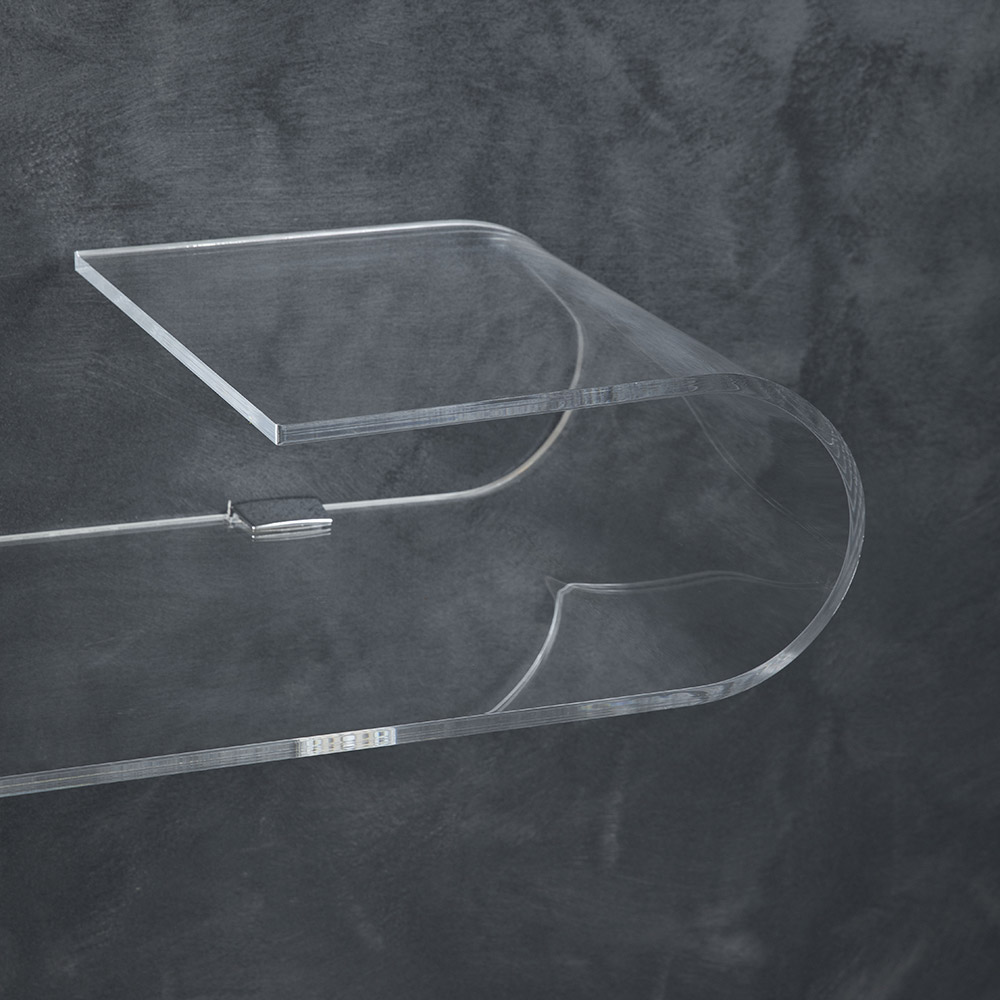 Ta konsola ścienna jest w całości wykonana z przezroczystego kryształu akrylowego o grubości 10 mm, wycinanego laserowo i składanego ręcznie, co zapewnia niezbędny i elegancki wygląd.