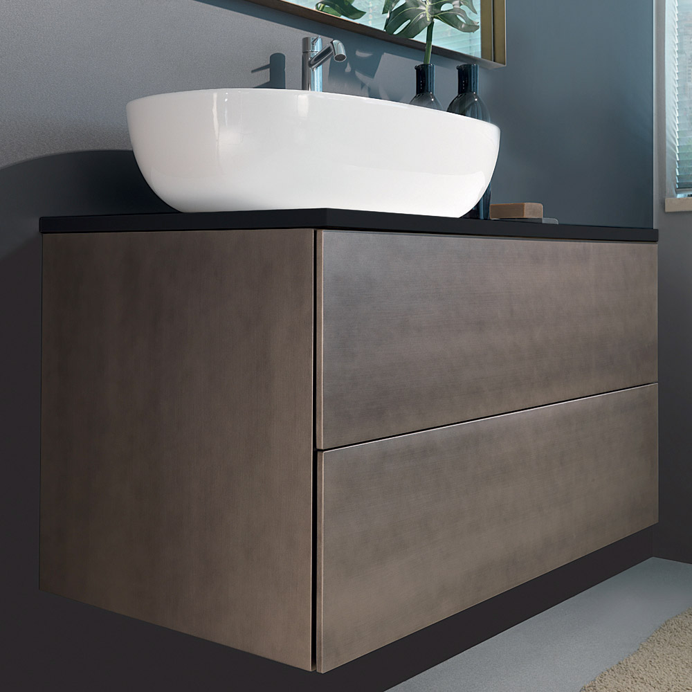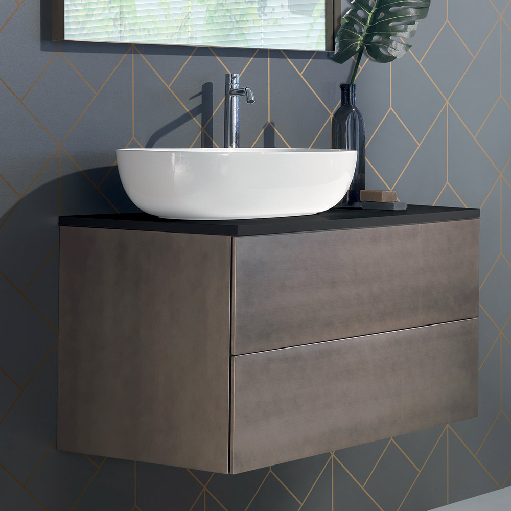podstawę umywalki z 2 szufladami z drewna MDF z cennym matowym wykończeniem w kolorze postarzanej platyny oraz matową, lakierowaną na czarno drewnianą powierzchnię z białą ceramiczną umywalką nablatową.