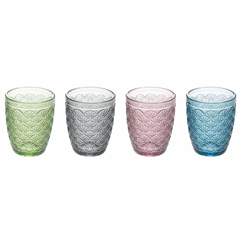 Komplet szklanek do wody w kolorowym szkle z dekoracją w liście, 12 sztuk.