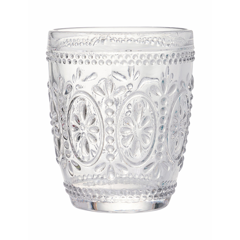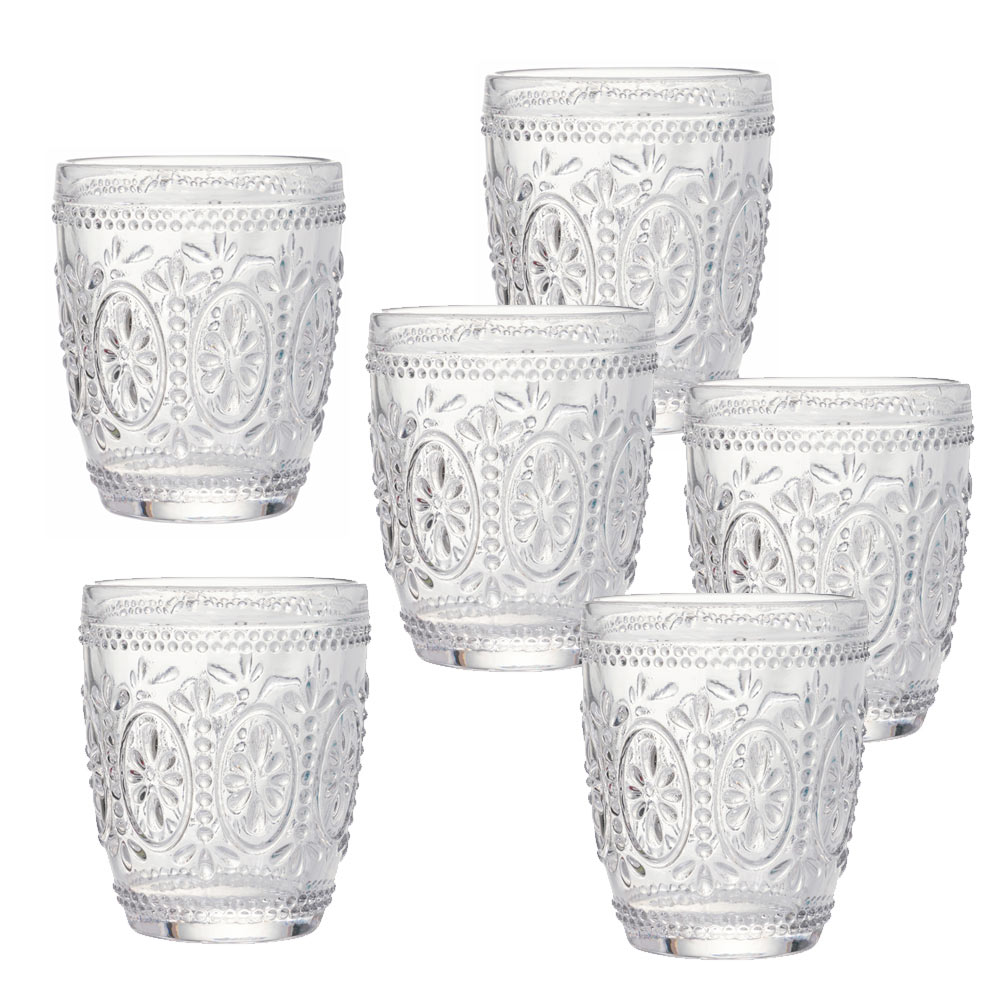 Komplet kieliszków do wody w przezroczystym szkle i barokowych zdobieniach, 12 sztuk.